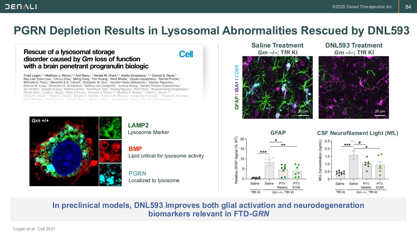 83 DNL593 (PTV:PGRN) Delivers PGRN to Key Cell Types in the Brain *In collaboration with Takeda DNL593/TAK-594* approach is highly differentiated from competitor PGRN approaches TransportVehicle Full Length PGRN • Molecule delivers full length PGRN that retains binding to Sortilin receptor • TfR tuned to maximize delivery of PGRN to the CNS and uptake into lysosomes of neurons and glial cells • Fc domain portion of TransportVehicle improves manufacturability and drug-like properties Key Characteristics Program status: Phase 1/2 Study Ongoing PTV:PGRN