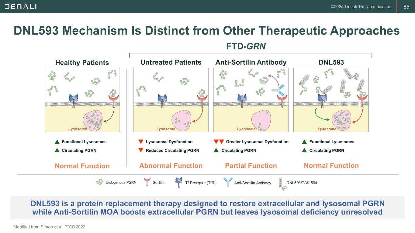 84 PGRN Depletion Results in Lysosomal Abnormalities Rescued by DNL593 Logan et al. Cell 2021 In preclinical models, DNL593 improves both glial activation and neurodegeneration biomarkers relevant in FTD-GRN LAMP2 Lysosome Marker BMP Lipid critical for lysosome activity PGRN Localized to lysosome Saline Treatment Grn –/–; TfR KI DNL593 Treatment Grn –/–; TfR KI 20 µm 20 µm GFAP CSF Neurofilament Light (NfL) G F A P I I B A 1 I C D 6 8