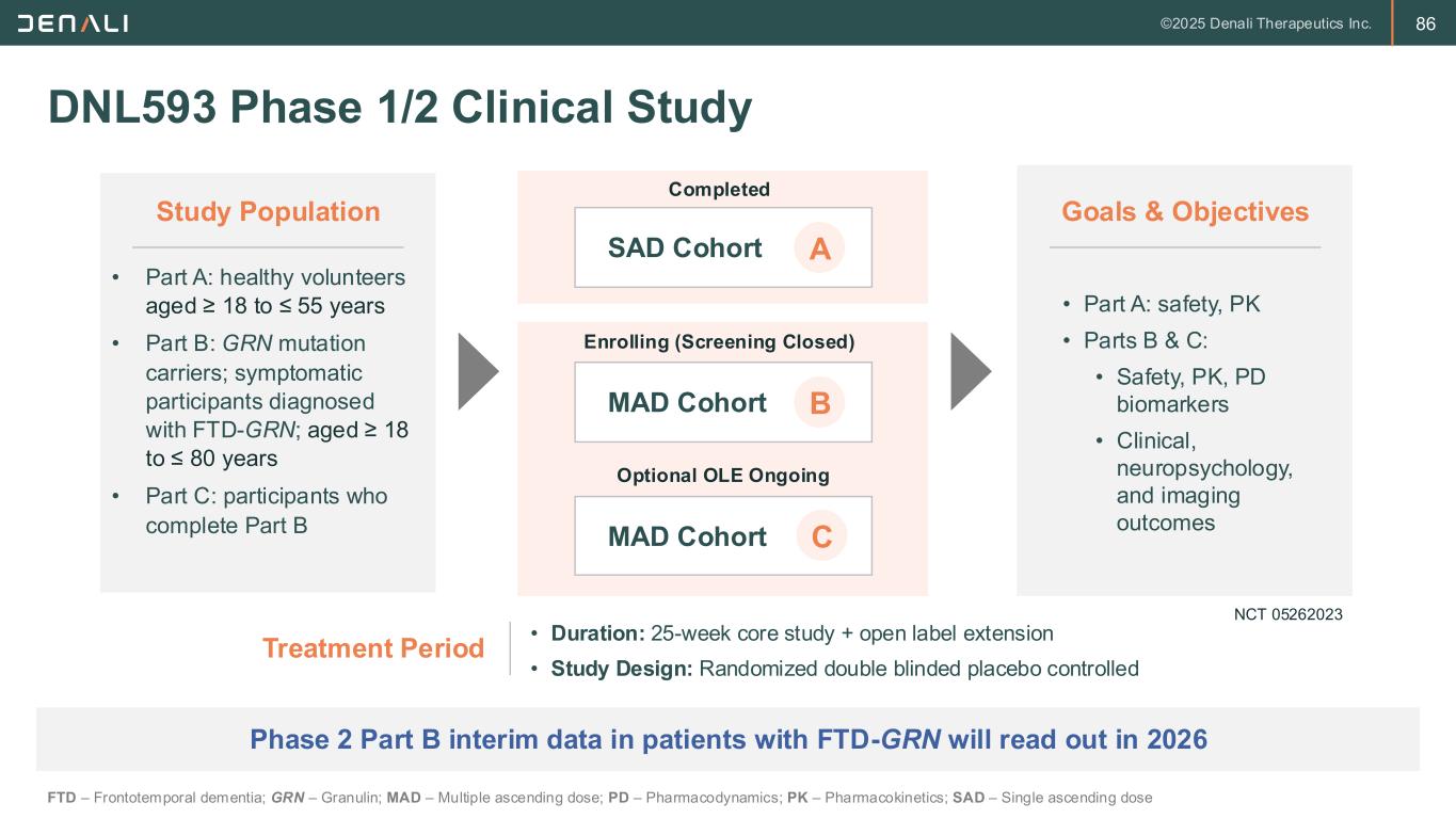 85 DNL593 Mechanism Is Distinct from Other Therapeutic Approaches Modified from Simon et al. TICB 2022 DNL593 is a protein replacement therapy designed to restore extracellular and lysosomal PGRN while Anti-Sortilin MOA boosts extracellular PGRN but leaves lysosomal deficiency unresolved Normal Function Normal FunctionPartial FunctionAbnormal Function FTD-GRN Healthy Patients Untreated Patients Anti-Sortilin Antibody DNL593 DNL593/TAK-594Endogenous PGRN Sortillin Tf Receptor (TfR) Anti-Sortillin Antibody