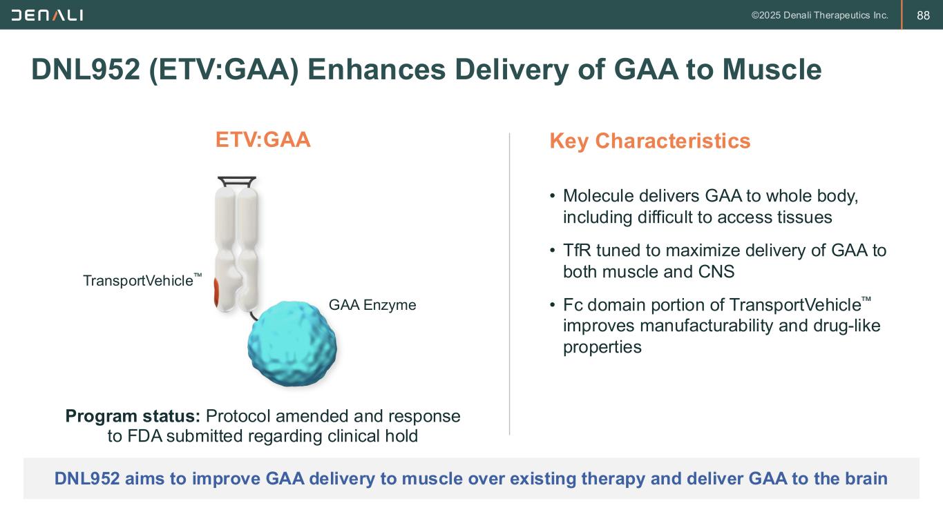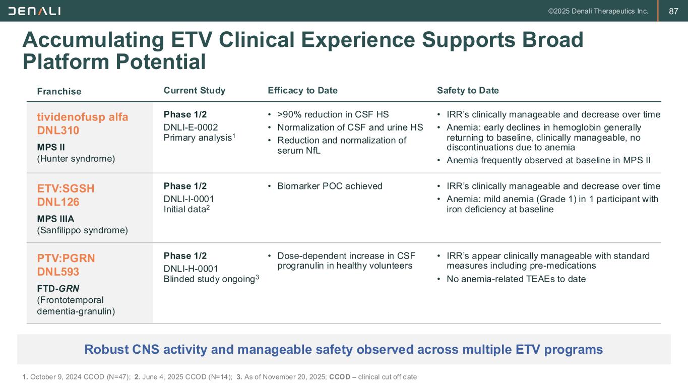 87 Franchise Current Study Efficacy to Date Safety to Date tividenofusp alfa DNL310 MPS II (Hunter syndrome) Phase 1/2 DNLI-E-0002 Primary analysis1 • >90% reduction in CSF HS • Normalization of CSF and urine HS • Reduction and normalization of serum NfL • IRR’s clinically manageable and decrease over time • Anemia: early declines in hemoglobin generally returning to baseline, clinically manageable, no discontinuations due to anemia • Anemia frequently observed at baseline in MPS II ETV:SGSH DNL126 MPS IIIA (Sanfilippo syndrome) Phase 1/2 DNLI-I-0001 Initial data2 • Biomarker POC achieved • IRR’s clinically manageable and decrease over time • Anemia: mild anemia (Grade 1) in 1 participant with iron deficiency at baseline PTV:PGRN DNL593 FTD-GRN (Frontotemporal dementia-granulin) Phase 1/2 DNLI-H-0001 Blinded study ongoing3 • Dose-dependent increase in CSF progranulin in healthy volunteers • IRR’s appear clinically manageable with standard measures including pre-medications • No anemia-related TEAEs to date Accumulating ETV Clinical Experience Supports Broad Platform Potential 1. October 9, 2024 CCOD (N=47); 2. June 4, 2025 CCOD (N=14); 3. As of November 20, 2025; CCOD – clinical cut off date Robust CNS activity and manageable safety observed across multiple ETV programs