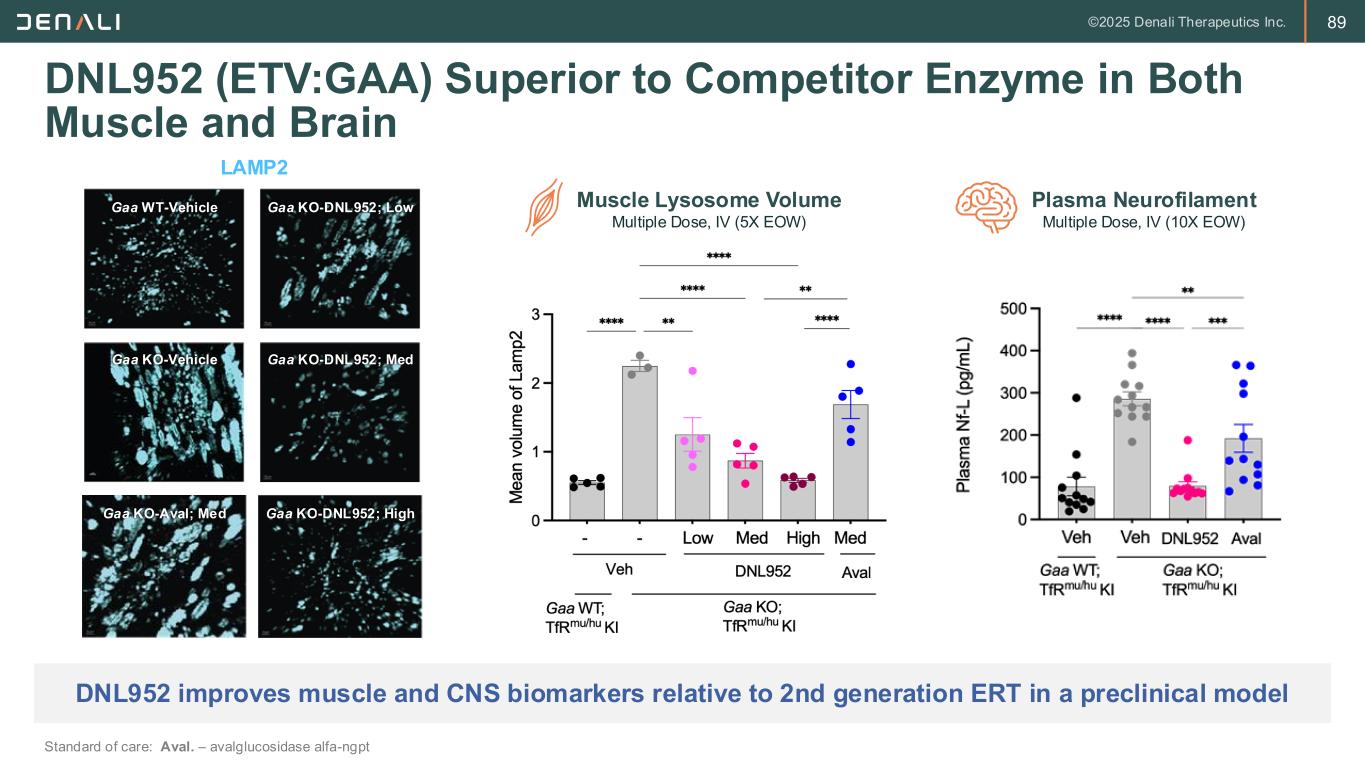 88 DNL952 (ETV:GAA) Enhances Delivery of GAA to Muscle DNL952 aims to improve GAA delivery to muscle over existing therapy and deliver GAA to the brain TransportVehicle • Molecule delivers GAA to whole body, including difficult to access tissues • TfR tuned to maximize delivery of GAA to both muscle and CNS • Fc domain portion of TransportVehicle improves manufacturability and drug-like properties Key Characteristics GAA Enzyme Program status: Protocol amended and response to FDA submitted regarding clinical hold ETV:GAA