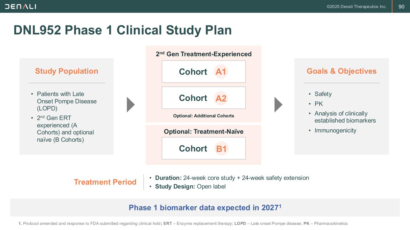 90 DNL952 Phase 1 Clinical Study Plan Phase 1 biomarker data expected in 20271 Cohort Cohort Cohort B1 A2 A1 • Patients with Late Onset Pompe Disease (LOPD) • 2nd Gen ERT experienced (A Cohorts) and optional naïve (B Cohorts) Study Population • Safety • PK • Analysis of clinically established biomarkers • Immunogenicity Goals & Objectives 2nd Gen Treatment-Experienced Optional: Treatment-Naïve Optional: Additional Cohorts Treatment Period • Duration: 24-week core study + 24-week safety extension • Study Design: Open label 1. Protocol amended and response to FDA submitted regarding clinical hold; ERT – Enzyme replacement therapy; LOPD – Late onset Pompe disease; PK – Pharmacokinetics
