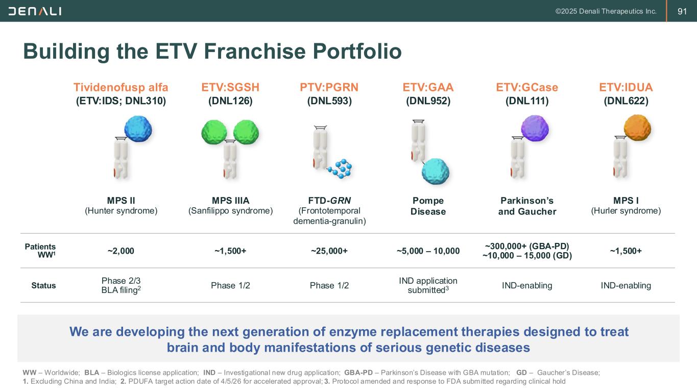 91 Tividenofusp alfa (ETV:IDS; DNL310) ETV:SGSH (DNL126) PTV:PGRN (DNL593) ETV:GAA (DNL952) ETV:GCase (DNL111) ETV:IDUA (DNL622) MPS II (Hunter syndrome) MPS IIIA (Sanfilippo syndrome) FTD-GRN (Frontotemporal dementia-granulin) Pompe Disease Parkinson’s and Gaucher MPS I (Hurler syndrome) Patients WW1 ~2,000 ~1,500+ ~25,000+ ~5,000 – 10,000 ~300,000+ (GBA-PD) ~10,000 – 15,000 (GD) ~1,500+ Status Phase 2/3 BLA filing2 Phase 1/2 Phase 1/2 IND application submitted3 IND-enabling IND-enabling Building the ETV Franchise Portfolio WW – Worldwide; BLA – Biologics license application; IND – Investigational new drug application; GBA-PD – Parkinson’s Disease with GBA mutation; GD – Gaucher’s Disease; 1. Excluding China and India; 2. PDUFA target action date of 4/5/26 for accelerated approval; 3. Protocol amended and response to FDA submitted regarding clinical hold We are developing the next generation of enzyme replacement therapies designed to treat brain and body manifestations of serious genetic diseases