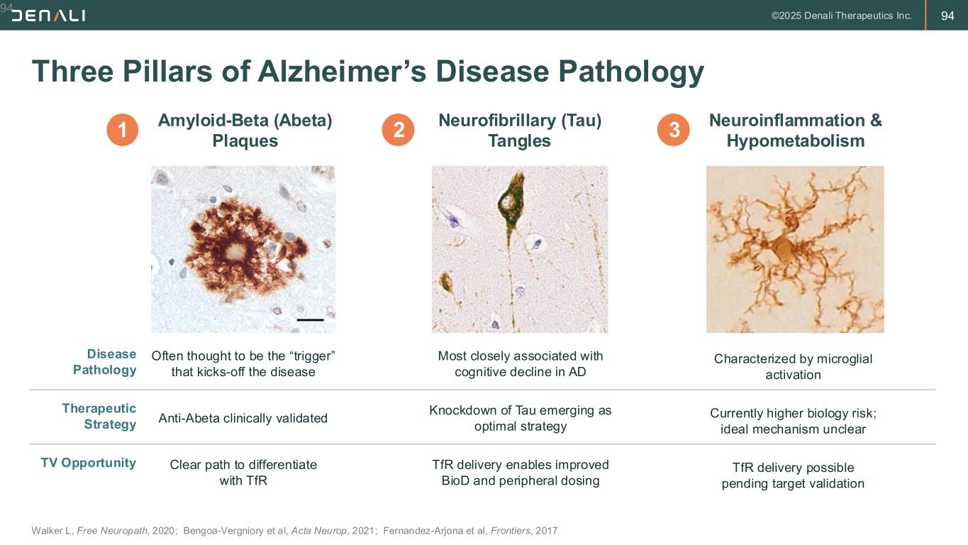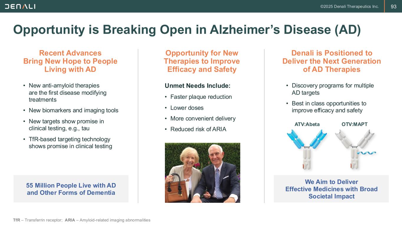 93 Opportunity is Breaking Open in Alzheimer’s Disease (AD) TfR – Transferrin receptor; ARIA – Amyloid-related imaging abnormalities • Discovery programs for multiple AD targets • Best in class opportunities to improve efficacy and safety Opportunity for New Therapies to Improve Efficacy and Safety Unmet Needs Include: • Faster plaque reduction • Lower doses • More convenient delivery • Reduced risk of ARIA Recent Advances Bring New Hope to People Living with AD • New anti-amyloid therapies are the first disease modifying treatments • New biomarkers and imaging tools • New targets show promise in clinical testing, e.g., tau • TfR-based targeting technology shows promise in clinical testing Denali is Positioned to Deliver the Next Generation of AD Therapies ATV:Abeta OTV:MAPT 55 Million People Live with AD and Other Forms of Dementia We Aim to Deliver Effective Medicines with Broad Societal Impact
