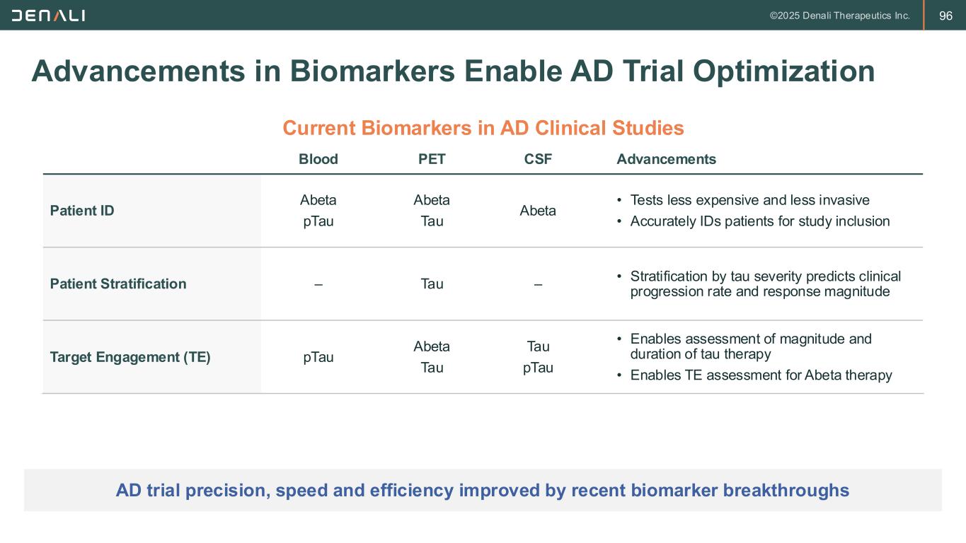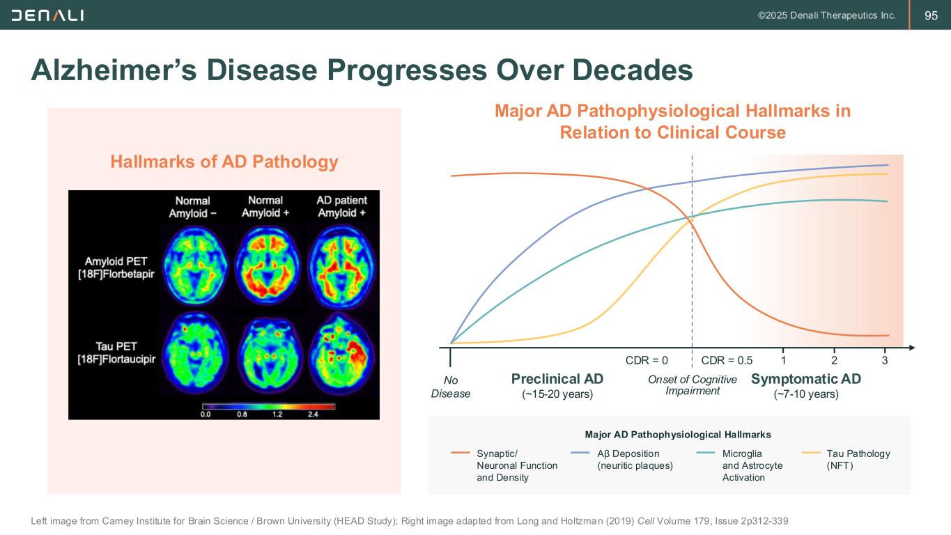 94 Three Pillars of Alzheimer’s Disease Pathology Walker L, Free Neuropath, 2020; Bengoa-Vergniory et al, Acta Neurop, 2021; Fernandez-Arjona et al, Frontiers, 2017 94 Amyloid-Beta (Abeta) Plaques 1 Neurofibrillary (Tau) Tangles 2 Neuroinflammation & Hypometabolism 3 Disease Pathology Often thought to be the “trigger” that kicks-off the disease Most closely associated with cognitive decline in AD Characterized by microglial activation Therapeutic Strategy Anti-Abeta clinically validated Knockdown of Tau emerging as optimal strategy Currently higher biology risk; ideal mechanism unclear TV Opportunity Clear path to differentiate with TfR TfR delivery enables improved BioD and peripheral dosing TfR delivery possible pending target validation