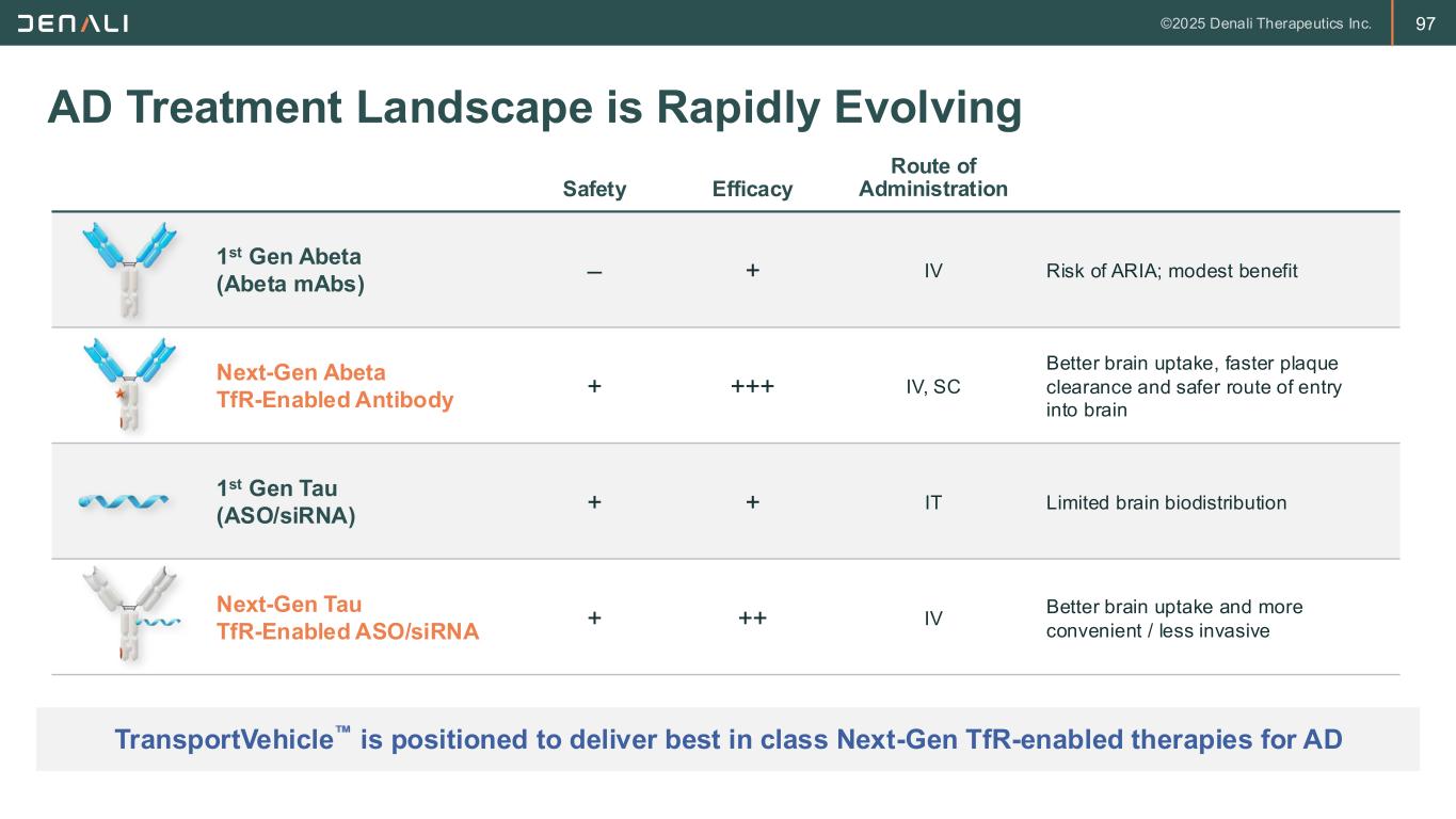 97 AD Treatment Landscape is Rapidly Evolving TransportVehicle is positioned to deliver best in class Next-Gen TfR-enabled therapies for AD Safety Efficacy Route of Administration 1st Gen Abeta (Abeta mAbs) – + IV Risk of ARIA; modest benefit Next-Gen Abeta TfR-Enabled Antibody + +++ IV, SC Better brain uptake, faster plaque clearance and safer route of entry into brain 1st Gen Tau (ASO/siRNA) + + IT Limited brain biodistribution Next-Gen Tau TfR-Enabled ASO/siRNA + ++ IV Better brain uptake and more convenient / less invasive