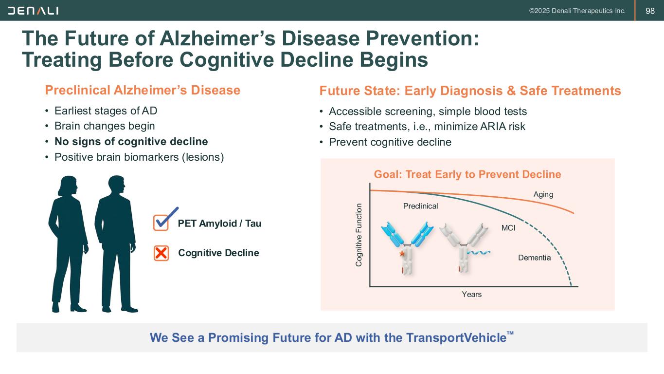 98 C o g n it iv e F u n ct io n Years Preclinical MCI Dementia Aging The Future of Alzheimer’s Disease Prevention: Treating Before Cognitive Decline Begins We See a Promising Future for AD with the TransportVehicle Preclinical Alzheimer’s Disease PET Amyloid / Tau Cognitive Decline Future State: Early Diagnosis & Safe Treatments Goal: Treat Early to Prevent Decline • Earliest stages of AD • Brain changes begin • No signs of cognitive decline • Positive brain biomarkers (lesions) • Accessible screening, simple blood tests • Safe treatments, i.e., minimize ARIA risk • Prevent cognitive decline