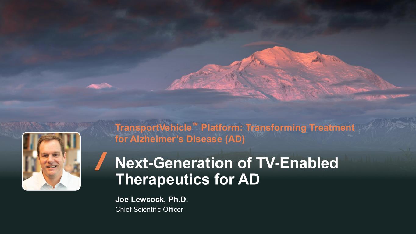 99 TransportVehicle Platform: Transforming Treatment for Alzheimer’s Disease (AD) Next-Generation of TV-Enabled Therapeutics for AD Joe Lewcock, Ph.D. Chief Scientific Officer