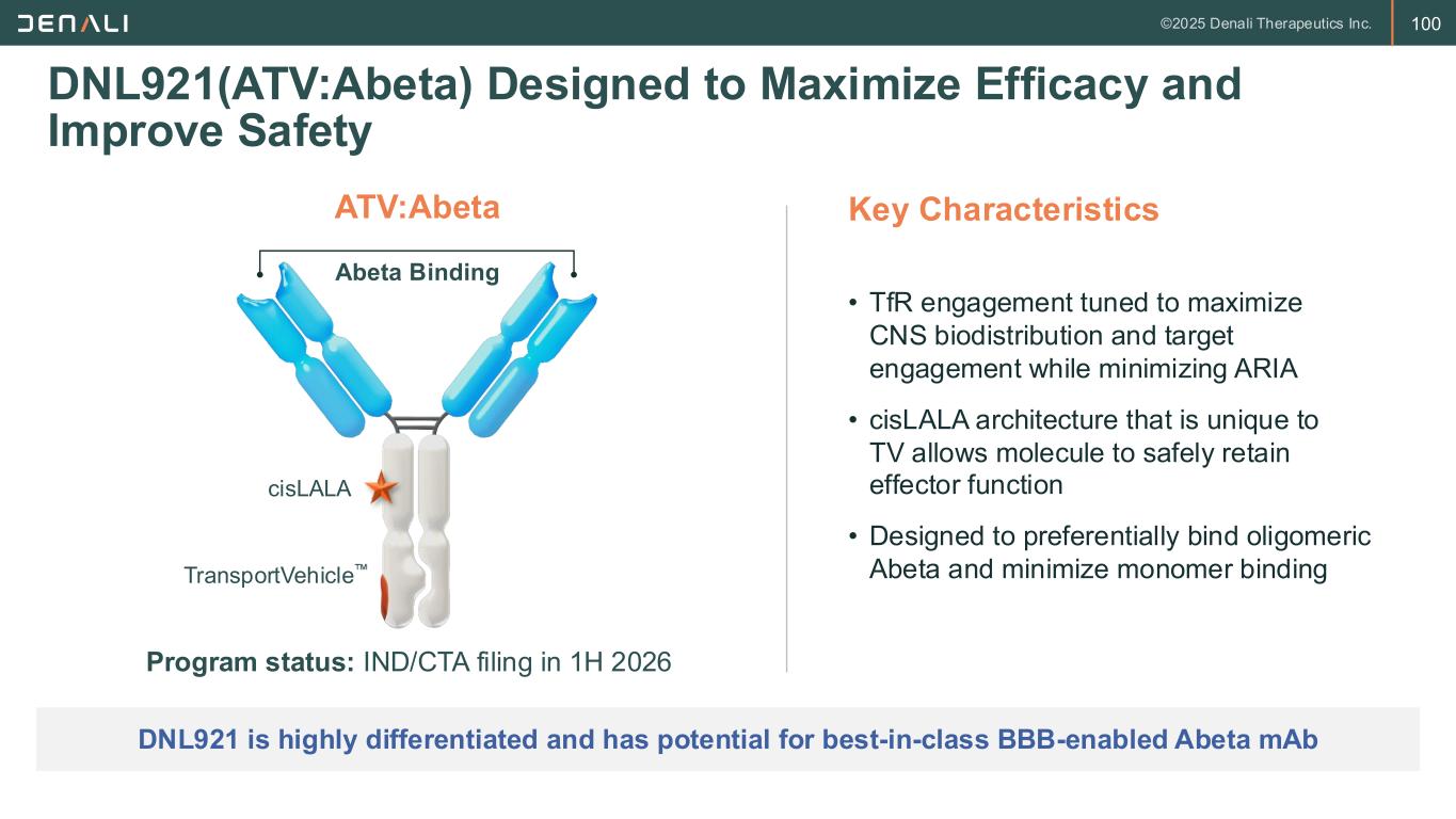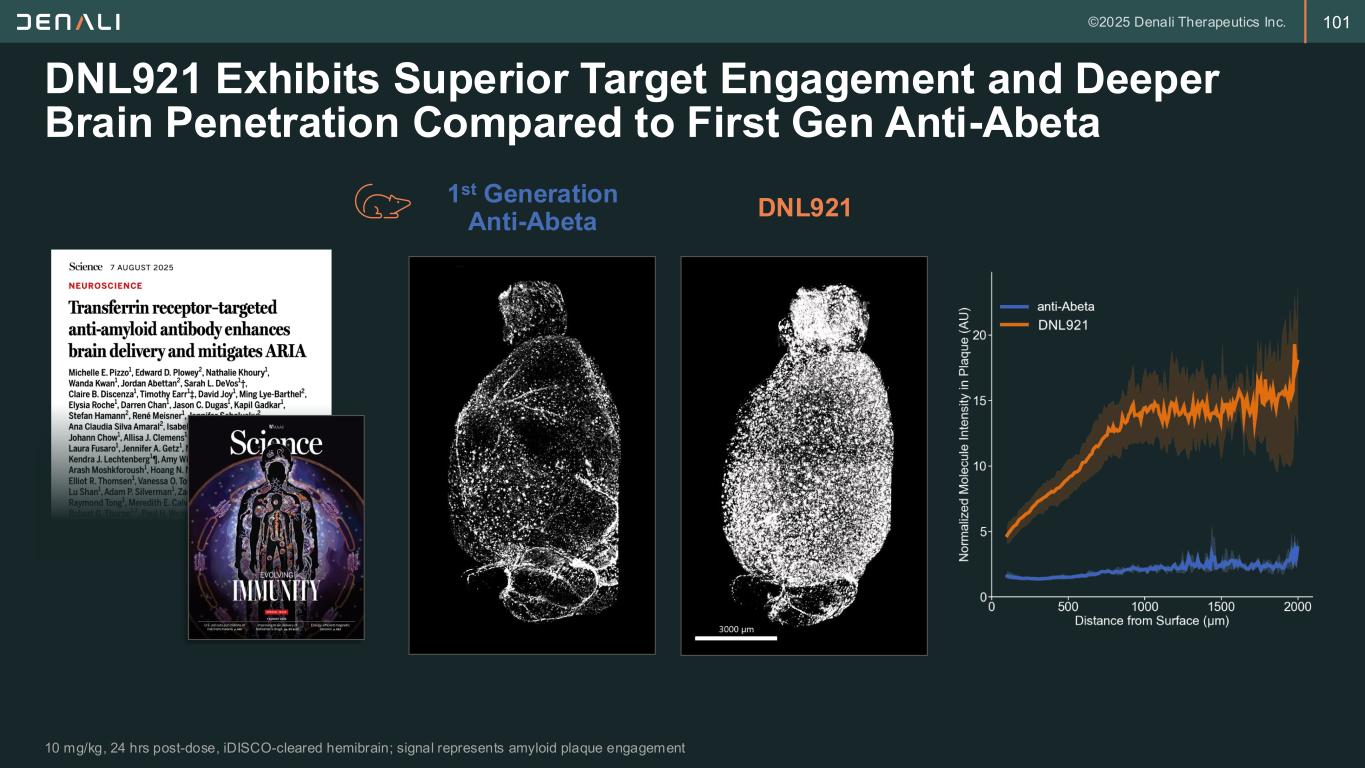 100 DNL921(ATV:Abeta) Designed to Maximize Efficacy and Improve Safety DNL921 is highly differentiated and has potential for best-in-class BBB-enabled Abeta mAb TransportVehicle cisLALA Abeta Binding • TfR engagement tuned to maximize CNS biodistribution and target engagement while minimizing ARIA • cisLALA architecture that is unique to TV allows molecule to safely retain effector function • Designed to preferentially bind oligomeric Abeta and minimize monomer binding Key Characteristics Program status: IND/CTA filing in 1H 2026 ATV:Abeta