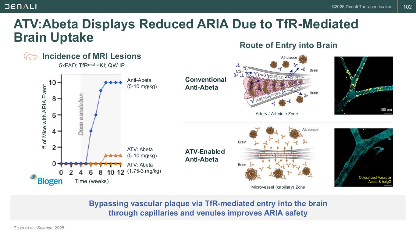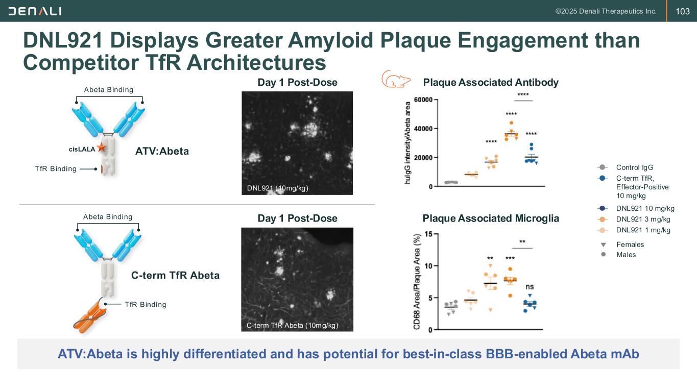 102 ATV:Abeta Displays Reduced ARIA Due to TfR-Mediated Brain Uptake Pizzo et al., Science, 2025 Bypassing vascular plaque via TfR-mediated entry into the brain through capillaries and venules improves ARIA safety Colocalized Vascular Abeta & huIgG 100 m Conventional Anti-Abeta ATV-Enabled Anti-Abeta Route of Entry into Brain Artery / Arteriole Zone Microvessel (capillary) Zone Anti-Abeta (5-10 mg/kg) ATV: Abeta (1.75-3 mg/kg) ATV: Abeta (5-10 mg/kg) # o f M ic e w it h A R IA E v e n t Time (weeks) Incidence of MRI Lesions 5xFAD; TfRmu/hu KI; QW IP