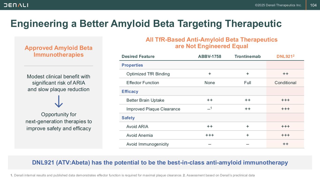 103 DNL921 Displays Greater Amyloid Plaque Engagement than Competitor TfR Architectures ATV:Abeta is highly differentiated and has potential for best-in-class BBB-enabled Abeta mAb C-term TfR Abeta (10mg/kg) DNL921 (10mg/kg) Day 1 Post-Dose Plaque Associated Antibody Plaque Associated Microglia Females Males Control IgG C-term TfR, Effector-Positive 10 mg/kg DNL921 10 mg/kg DNL921 3 mg/kg DNL921 1 mg/kg Day 1 Post-Dose cisLALA ATV:Abeta Abeta Binding TfR Binding C-term TfR Abeta TfR Binding Abeta Binding
