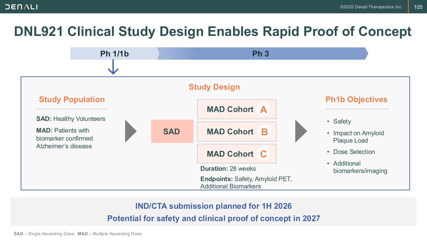 104 Engineering a Better Amyloid Beta Targeting Therapeutic 1. Denali internal results and published data demonstrates effector function is required for maximal plaque clearance. 2. Assessment based on Denali’s preclinical data DNL921 (ATV:Abeta) has the potential to be the best-in-class anti-amyloid immunotherapy Approved Amyloid Beta Immunotherapies Modest clinical benefit with significant risk of ARIA and slow plaque reduction Opportunity for next-generation therapies to improve safety and efficacy Desired Feature ABBV-1758 Trontinemab DNL9212 Properties Optimized TfR Binding + + ++ Effector Function None Full Conditional Efficacy Better Brain Uptake ++ ++ +++ Improved Plaque Clearance –1 ++ +++ Safety Avoid ARIA ++ + +++ Avoid Anemia +++ + +++ Avoid Immunogenicity – – ++ All TfR-Based Anti-Amyloid Beta Therapeutics are Not Engineered Equal
