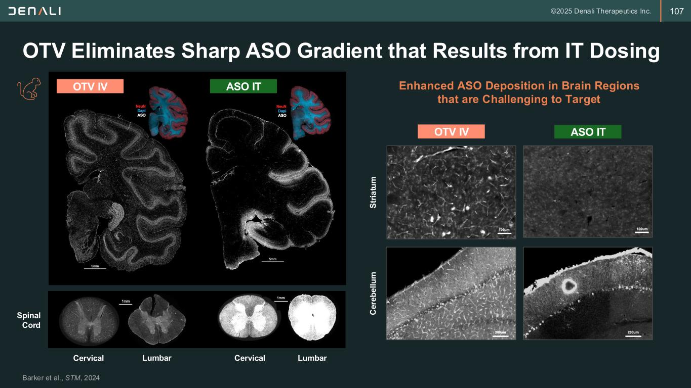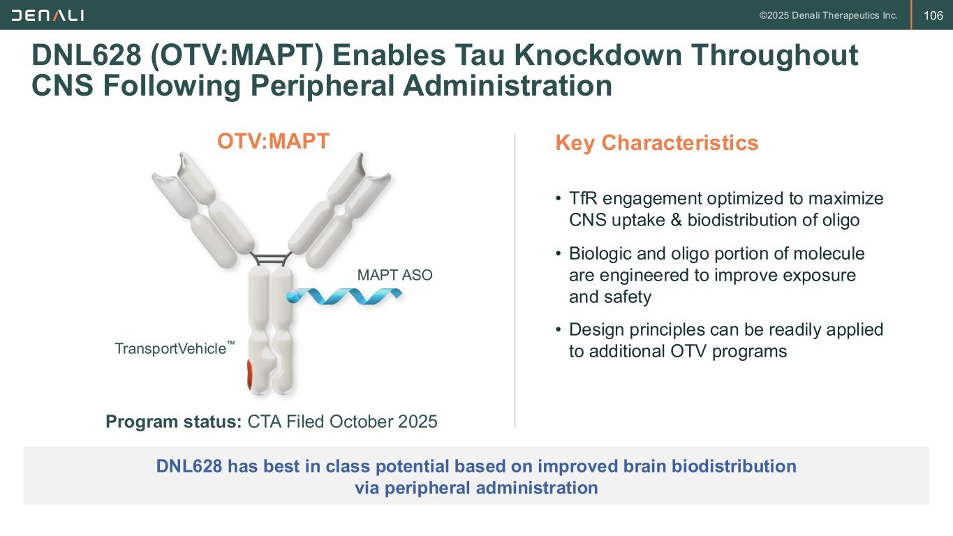 106 DNL628 (OTV:MAPT) Enables Tau Knockdown Throughout CNS Following Peripheral Administration DNL628 has best in class potential based on improved brain biodistribution via peripheral administration • TfR engagement optimized to maximize CNS uptake & biodistribution of oligo • Biologic and oligo portion of molecule are engineered to improve exposure and safety • Design principles can be readily applied to additional OTV programs Key Characteristics Program status: CTA Filed October 2025 OTV:MAPT TransportVehicle MAPT ASO