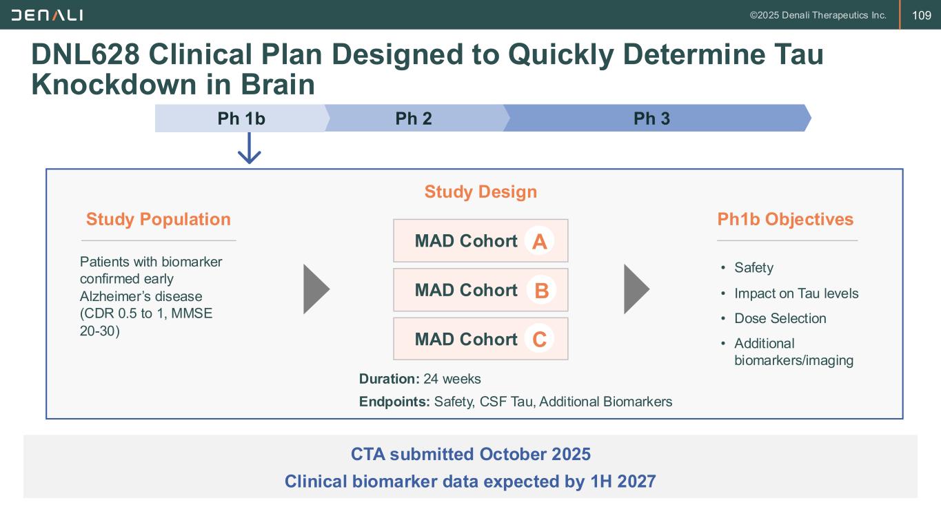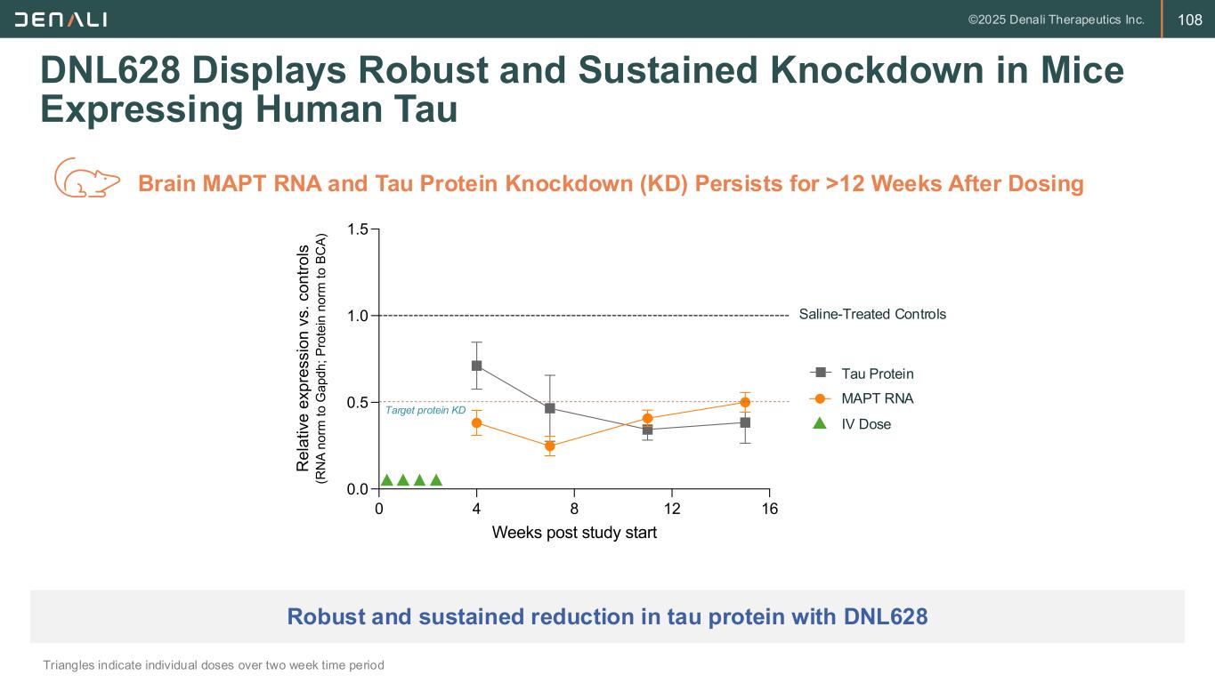 108 DNL628 Displays Robust and Sustained Knockdown in Mice Expressing Human Tau Triangles indicate individual doses over two week time period Robust and sustained reduction in tau protein with DNL628 Brain MAPT RNA and Tau Protein Knockdown (KD) Persists for >12 Weeks After Dosing 0 4 8 12 16 0.0 0.5 1.0 1.5 Weeks post study start (Dosing period = 3wks, so subtract 3 for Weeks post final dose) M A P T R N A e x p re s s io n (N o rm a liz e d t o G a p d h a n d S a lin e ) DNL628 Knockdown Timecourse in hTau x hTfR mice DNLI-24-23 and DNLI-23-202 MAPT RNA Tau Protein R e la ti v e e x p re s s io n v s . c o n tr o ls (R N A n o rm t o G a p d h ; P ro te in n o rm t o B C A ) Saline-treated controls 0 4 8 12 16 0.0 0.5 1.0 1.5 Weeks post study start (Dosing period = 3wks, so subtract 3 for Weeks post final dose) M A P T R N A e x p re s s io n (N o rm a liz e d t o G a p d h a n d S a lin e ) DNL628 Knockdown Timecourse in hTau x hTfR mice DNLI-24-23 and DNLI-23-202 MAPT RNA Tau Protein IV doseTarget protein KD Saline-Treated Controls 0 4 8 12 16 0.0 0.5 1.0 1.5 Weeks post study start (Dosing period = 3wks, so subtract 3 for Weeks post final dose) M A P T R N A e x p re s s io n (N o rm a liz e d t o G a p d h a n d S a lin e ) DNL628 Knockdown Timecourse in hTau x hTfR mice DNLI-24-23 and DNLI-23-202 MAPT RNA Tau Protein R e la ti v e e x p re s s io n v s . c o n tr o ls (R N A n o rm t o G a p d h ; P ro te in n o rm t o B C A ) Saline-treated controls 0 4 8 12 16 0.0 0.5 1.0 1.5 Weeks post study start (Dosing period = 3wks, so subtract 3 for Weeks post final dose) M A P T R N A e x p re s s io n (N o rm a liz e d t o G a p d h a n d S a lin e ) DNL628 Knockdown Timecourse in hTau x hTfR mice DNLI-24-23 and DNLI-23-202 MAPT RNA Tau Protein IV dose Protein PT RNA D se
