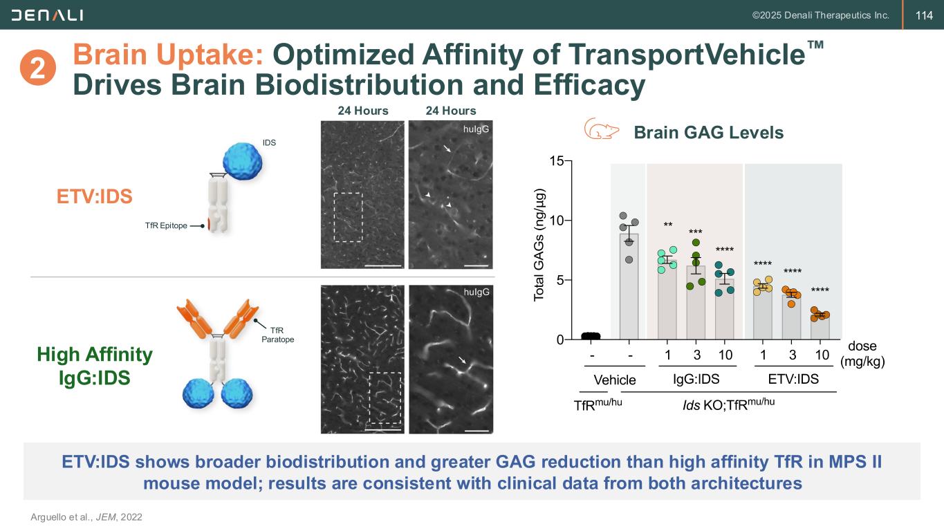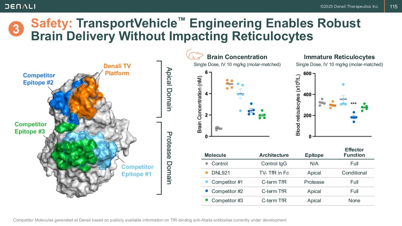 114 Brain Uptake: Optimized Affinity of TransportVehicle Drives Brain Biodistribution and Efficacy Arguello et al., JEM, 2022 ETV:IDS shows broader biodistribution and greater GAG reduction than high affinity TfR in MPS II mouse model; results are consistent with clinical data from both architectures ETV:IDS High Affinity IgG:IDS Brain GAG Levels TfR Paratope TfR Epitope IDS 24 Hours 24 Hours 2