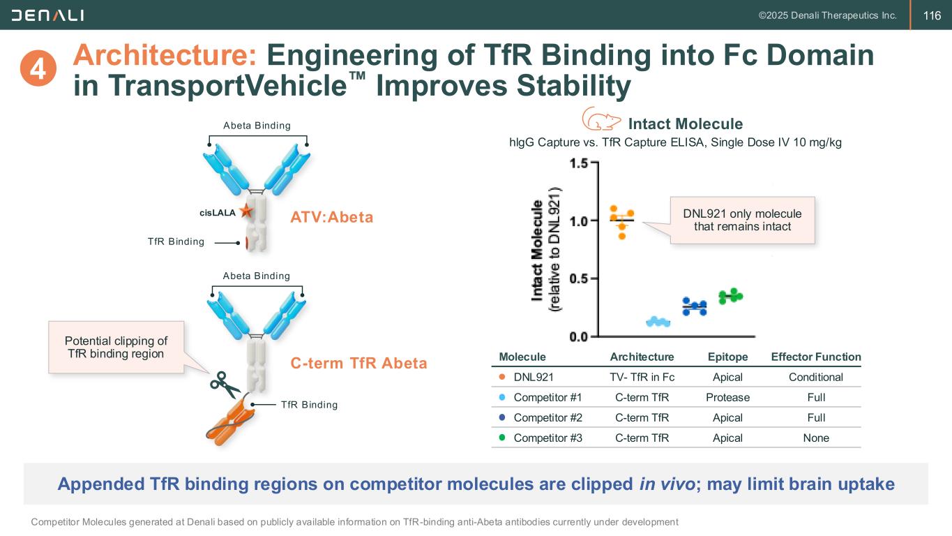 115 Safety: TransportVehicle Engineering Enables Robust Brain Delivery Without Impacting Reticulocytes Competitor Molecules generated at Denali based on publicly available information on TfR-binding anti-Abeta antibodies currently under development Molecule Architecture Epitope Effector Function Control Control IgG N/A Full DNL921 TV- TfR in Fc Apical Conditional Competitor #1 C-term TfR Protease Full Competitor #2 C-term TfR Apical Full Competitor #3 C-term TfR Apical None Brain Concentration Single Dose, IV 10 mg/kg (molar-matched) Immature Reticulocytes Single Dose, IV 10 mg/kg (molar-matched) 3