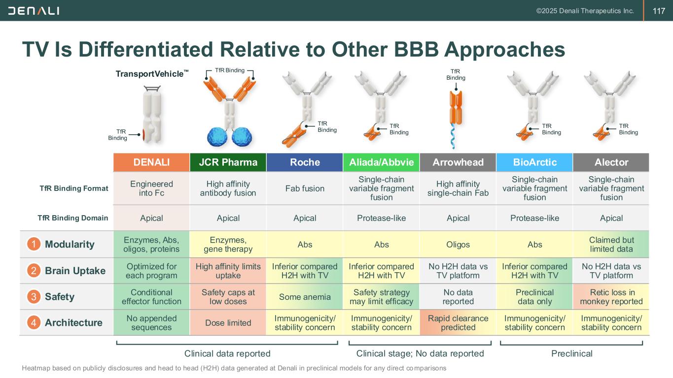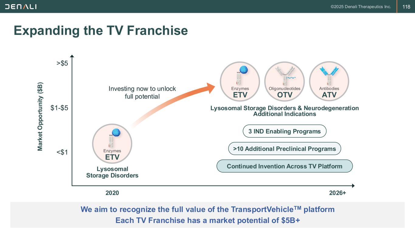 117 TV Is Differentiated Relative to Other BBB Approaches Heatmap based on publicly disclosures and head to head (H2H) data generated at Denali in preclinical models for any direct comparisons DENALI JCR Pharma Roche Aliada/Abbvie Arrowhead BioArctic Alector TfR Binding Format Engineered into Fc High affinity antibody fusion Fab fusion Single-chain variable fragment fusion High affinity single-chain Fab Single-chain variable fragment fusion Single-chain variable fragment fusion TfR Binding Domain Apical Apical Apical Protease-like Apical Protease-like Apical Modularity Enzymes, Abs, oligos, proteins Enzymes, gene therapy Abs Abs Oligos Abs Claimed but limited data Brain Uptake Optimized for each program High affinity limits uptake Inferior compared H2H with TV Inferior compared H2H with TV No H2H data vs TV platform Inferior compared H2H with TV No H2H data vs TV platform Safety Conditional effector function Safety caps at low doses Some anemia Safety strategy may limit efficacy No data reported Preclinical data only Retic loss in monkey reported Architecture No appended sequences Dose limited Immunogenicity/ stability concern Immunogenicity/ stability concern Rapid clearance predicted Immunogenicity/ stability concern Immunogenicity/ stability concern TransportVehicle 1 3 2 4 TfR Binding TfR Binding TfR Binding TfR Binding TfR Binding TfR Binding Clinical stage; No data reported PreclinicalClinical data reported TfR Binding
