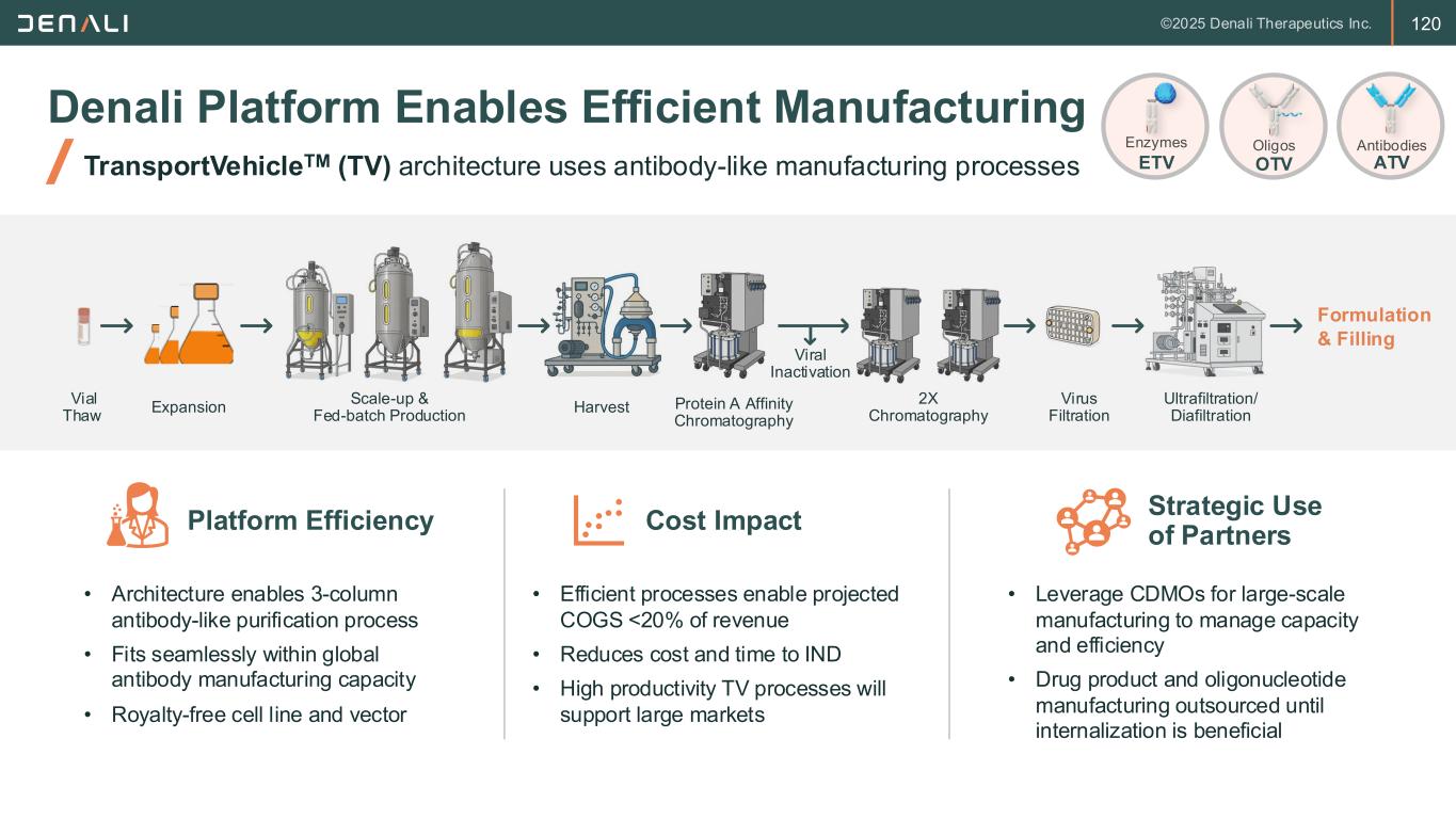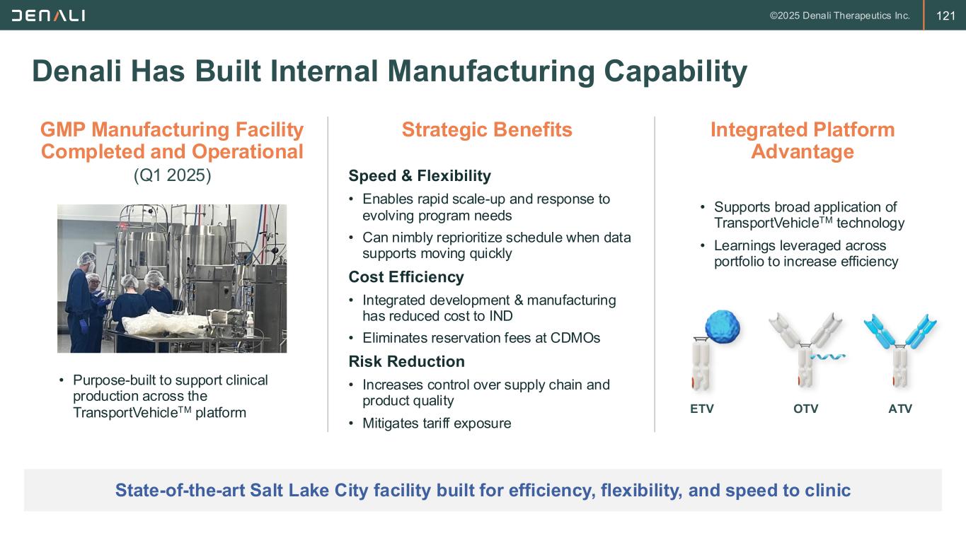 120 Denali Platform Enables Efficient Manufacturing TransportVehicleTM (TV) architecture uses antibody-like manufacturing processes Vial Thaw Expansion Harvest Protein A Affinity Chromatography 2X Chromatography Virus Filtration Formulation & Filling • Architecture enables 3-column antibody-like purification process • Fits seamlessly within global antibody manufacturing capacity • Royalty-free cell line and vector Platform Efficiency • Efficient processes enable projected COGS <20% of revenue • Reduces cost and time to IND • High productivity TV processes will support large markets Cost Impact • Leverage CDMOs for large-scale manufacturing to manage capacity and efficiency • Drug product and oligonucleotide manufacturing outsourced until internalization is beneficial Strategic Use of Partners Viral Inactivation Ultrafiltration/ Diafiltration Scale-up & Fed-batch Production ATV Antibodies OTV Oligos ETV Enzymes
