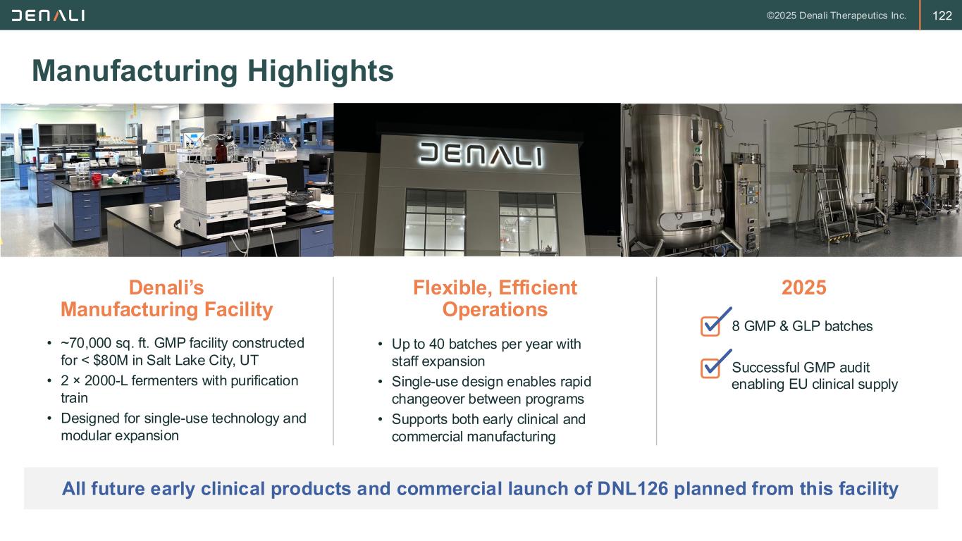 121 Denali Has Built Internal Manufacturing Capability State-of-the-art Salt Lake City facility built for efficiency, flexibility, and speed to clinic GMP Manufacturing Facility Completed and Operational (Q1 2025) • Purpose-built to support clinical production across the TransportVehicleTM platform Strategic Benefits Speed & Flexibility • Enables rapid scale-up and response to evolving program needs • Can nimbly reprioritize schedule when data supports moving quickly Cost Efficiency • Integrated development & manufacturing has reduced cost to IND • Eliminates reservation fees at CDMOs Risk Reduction • Increases control over supply chain and product quality • Mitigates tariff exposure Integrated Platform Advantage • Supports broad application of TransportVehicleTM technology • Learnings leveraged across portfolio to increase efficiency ETV OTV ATV