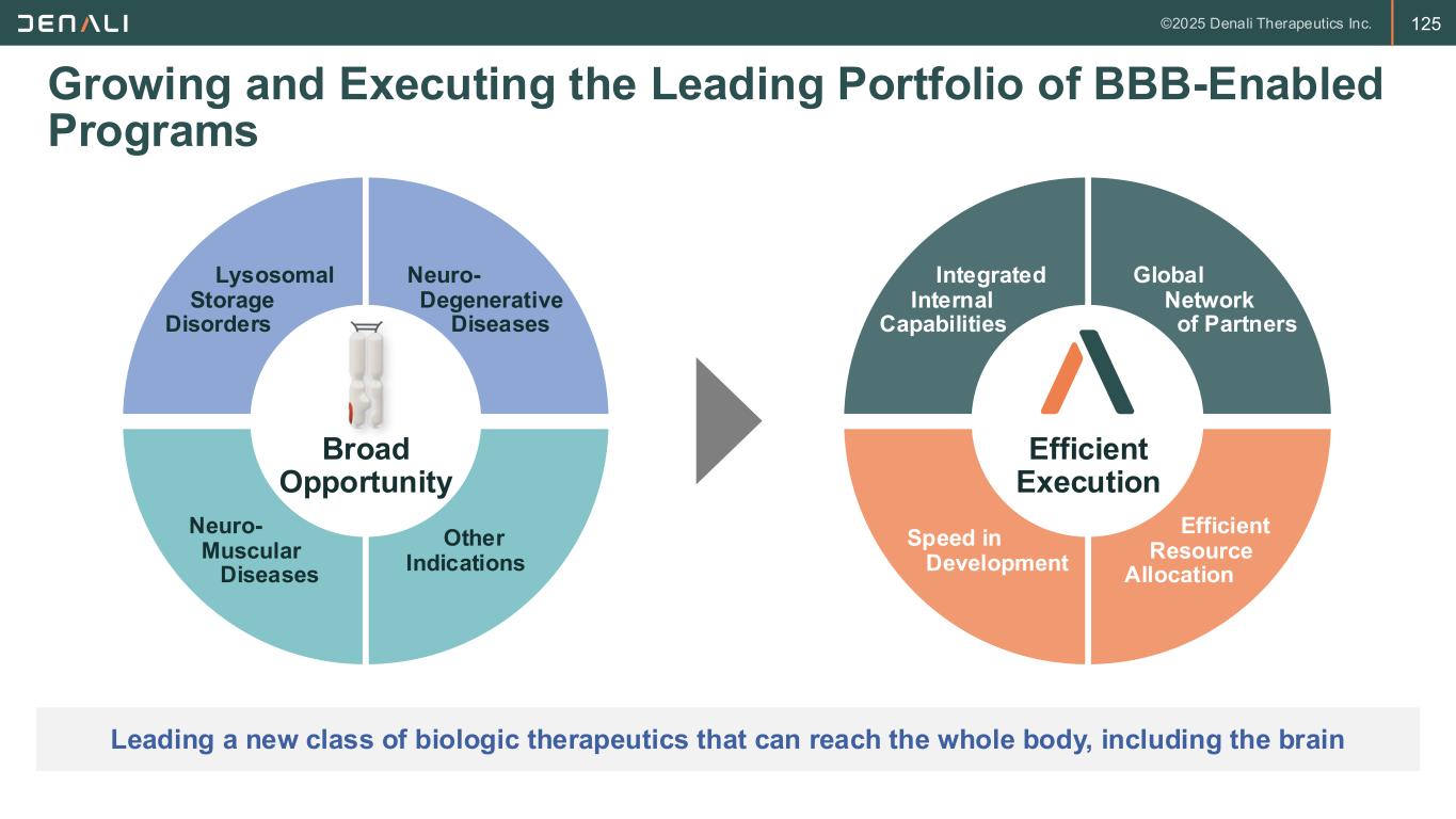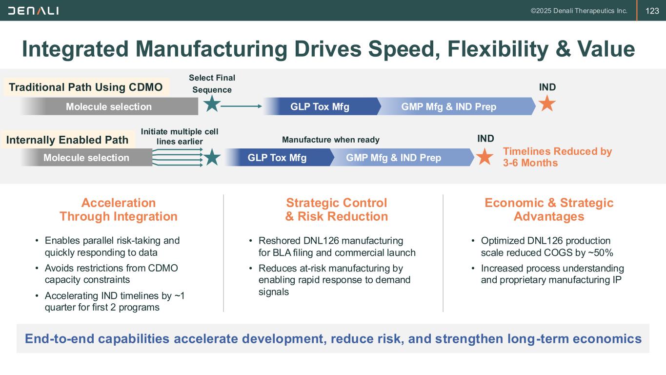 122 Manufacturing Highlights All future early clinical products and commercial launch of DNL126 planned from this facility Denali’s Manufacturing Facility Flexible, Efficient Operations 2025 • ~70,000 sq. ft. GMP facility constructed for < $80M in Salt Lake City, UT • 2 × 2000-L fermenters with purification train • Designed for single-use technology and modular expansion • Up to 40 batches per year with staff expansion • Single-use design enables rapid changeover between programs • Supports both early clinical and commercial manufacturing 8 GMP & GLP batches Successful GMP audit enabling EU clinical supply