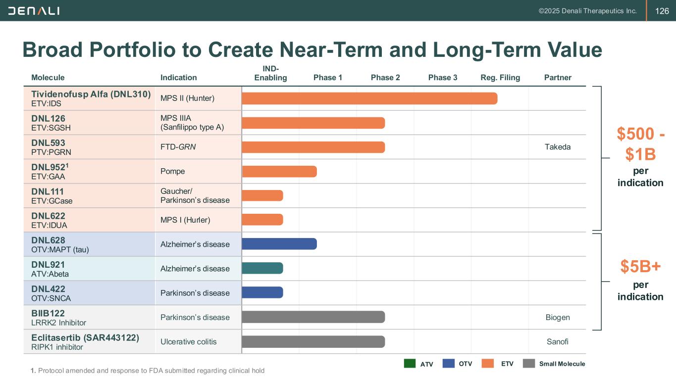 126 Broad Portfolio to Create Near-Term and Long-Term Value Molecule Indication IND- Enabling Phase 1 Phase 2 Phase 3 Reg. Filing Partner Tividenofusp Alfa (DNL310) ETV:IDS MPS II (Hunter) DNL126 ETV:SGSH MPS IIIA (Sanfilippo type A) DNL593 PTV:PGRN FTD-GRN Takeda DNL9521 ETV:GAA Pompe DNL111 ETV:GCase Gaucher/ Parkinson’s disease DNL622 ETV:IDUA MPS I (Hurler) DNL628 OTV:MAPT (tau) Alzheimer’s disease DNL921 ATV:Abeta Alzheimer’s disease DNL422 OTV:SNCA Parkinson’s disease BIIB122 LRRK2 Inhibitor Parkinson’s disease Biogen Eclitasertib (SAR443122) RIPK1 inhibitor Ulcerative colitis Sanofi ATV Small MoleculeETVOTV $500 - $1B $5B+ per indication per indication 1. Protocol amended and response to FDA submitted regarding clinical hold