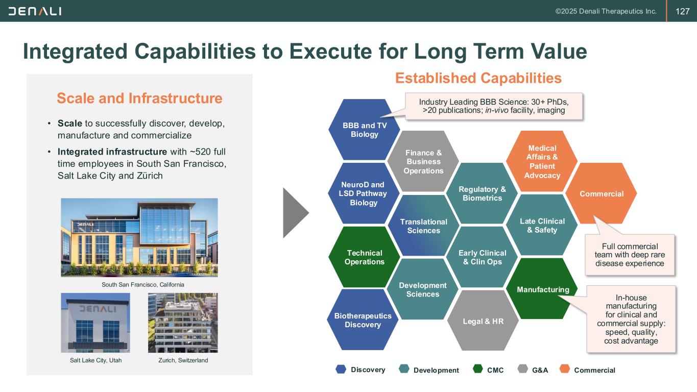 123 GMP Mfg & IND Prep GMP Mfg & IND Prep Integrated Manufacturing Drives Speed, Flexibility & Value End-to-end capabilities accelerate development, reduce risk, and strengthen long-term economics Select Final Sequence IND Initiate multiple cell lines earlier GLP Tox Mfg GLP Tox Mfg Molecule selection Molecule selection Timelines Reduced by 3-6 Months IND Acceleration Through Integration • Enables parallel risk-taking and quickly responding to data • Avoids restrictions from CDMO capacity constraints • Accelerating IND timelines by ~1 quarter for first 2 programs Strategic Control & Risk Reduction • Reshored DNL126 manufacturing for BLA filing and commercial launch • Reduces at-risk manufacturing by enabling rapid response to demand signals Economic & Strategic Advantages • Optimized DNL126 production scale reduced COGS by ~50% • Increased process understanding and proprietary manufacturing IP Traditional Path Using CDMO Internally Enabled Path Manufacture when ready