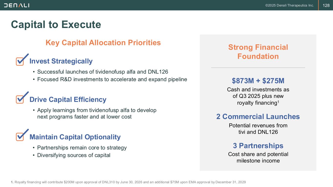 128 Capital to Execute Strong Financial Foundation $873M + $275M 2 Commercial Launches Cash and investments as of Q3 2025 plus new royalty financing1 Potential revenues from tivi and DNL126 Key Capital Allocation Priorities Invest Strategically • Successful launches of tividenofusp alfa and DNL126 • Focused R&D investments to accelerate and expand pipeline Maintain Capital Optionality • Partnerships remain core to strategy • Diversifying sources of capital Drive Capital Efficiency • Apply learnings from tividenofusp alfa to develop next programs faster and at lower cost 3 Partnerships Cost share and potential milestone income 1. Royalty financing will contribute $200M upon approval of DNL310 by June 30, 2026 and an additional $75M upon EMA approval by December 31, 2029