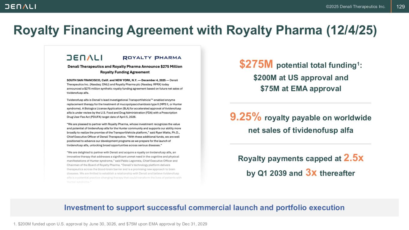 129 Royalty Financing Agreement with Royalty Pharma (12/4/25) 1. $200M funded upon U.S. approval by June 30, 3026, and $75M upon EMA approval by Dec 31, 2029 Investment to support successful commercial launch and portfolio execution 9.25% royalty payable on worldwide net sales of tividenofusp alfa $275M potential total funding1: $200M at US approval and $75M at EMA approval Royalty payments capped at 2.5x by Q1 2039 and 3x thereafter