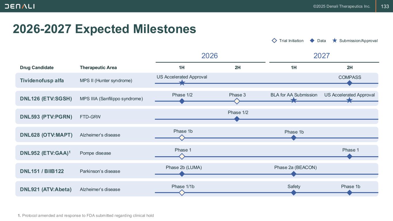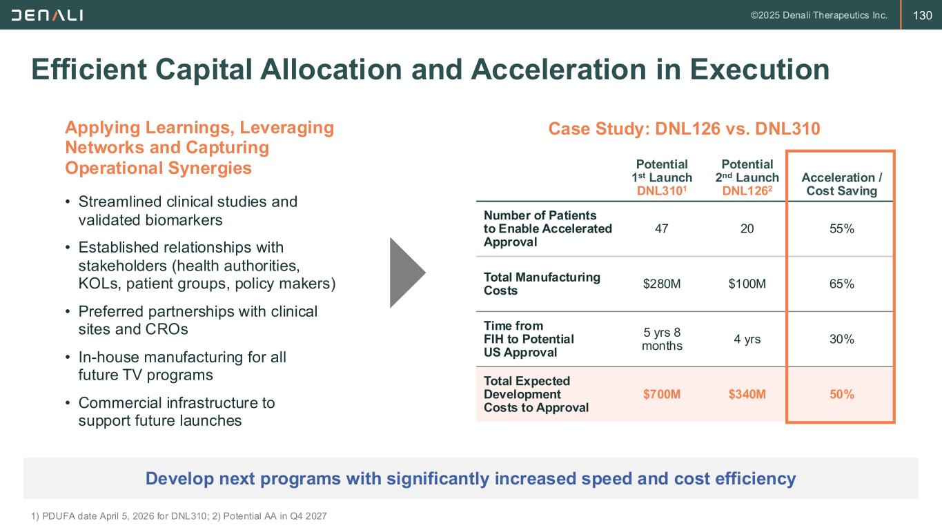 130 Efficient Capital Allocation and Acceleration in Execution 1) PDUFA date April 5, 2026 for DNL310; 2) Potential AA in Q4 2027 Develop next programs with significantly increased speed and cost efficiency Applying Learnings, Leveraging Networks and Capturing Operational Synergies Potential 1st Launch DNL3101 Potential 2nd Launch DNL1262 Acceleration / Cost Saving Number of Patients to Enable Accelerated Approval 47 20 55% Total Manufacturing Costs $280M $100M 65% Time from FIH to Potential US Approval 5 yrs 8 months 4 yrs 30% Total Expected Development Costs to Approval $700M $340M 50% • Streamlined clinical studies and validated biomarkers • Established relationships with stakeholders (health authorities, KOLs, patient groups, policy makers) • Preferred partnerships with clinical sites and CROs • In-house manufacturing for all future TV programs • Commercial infrastructure to support future launches Case Study: DNL126 vs. DNL310