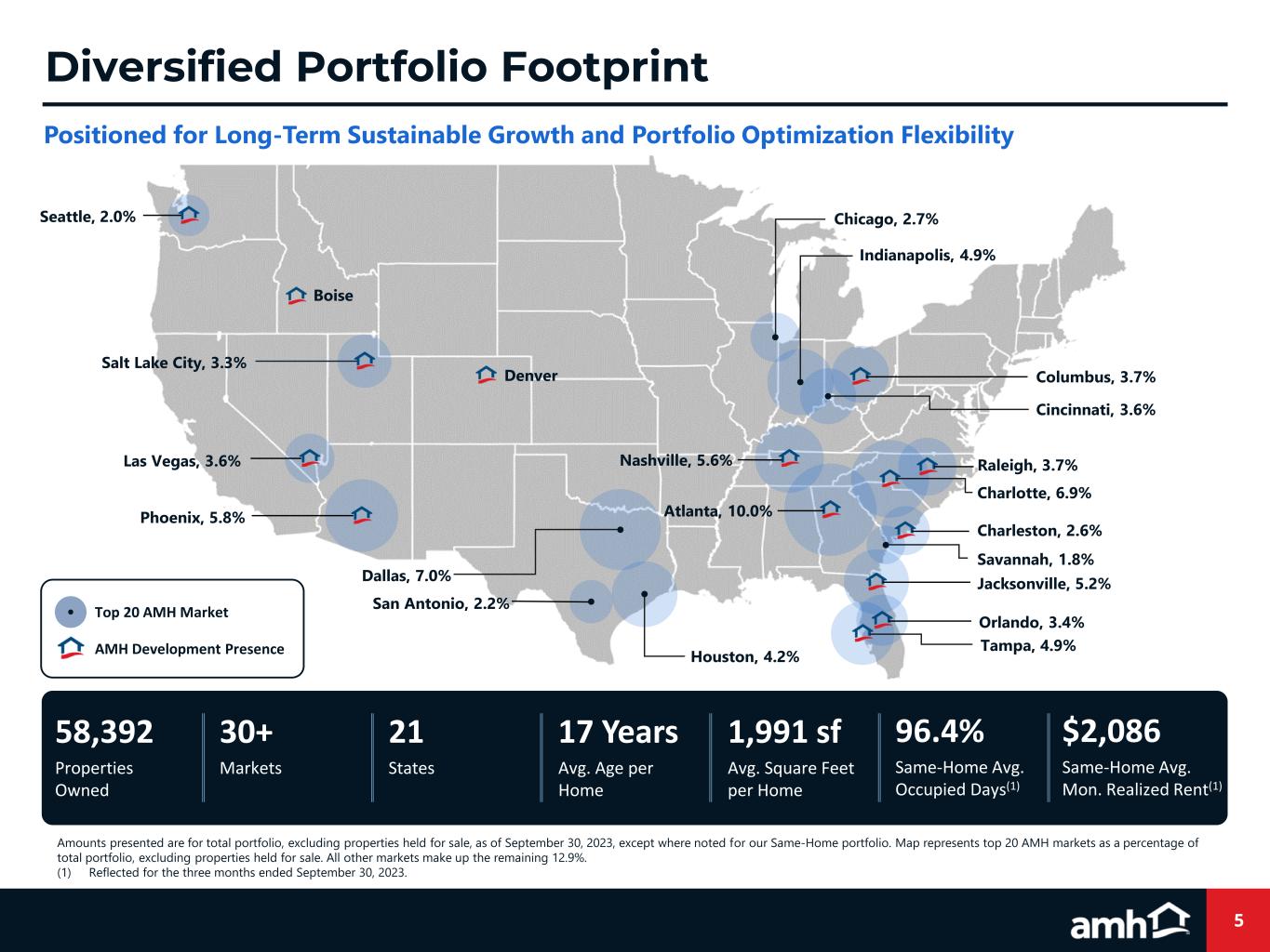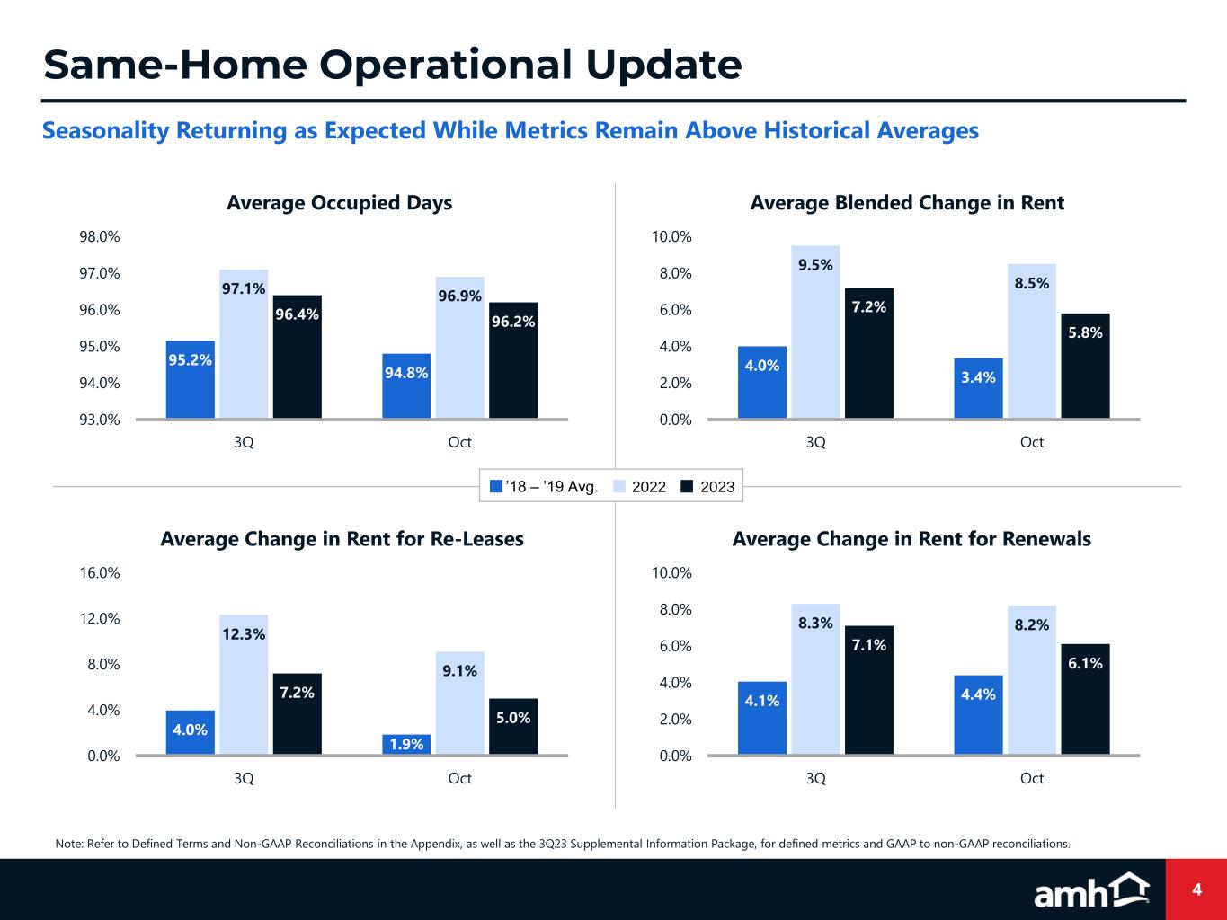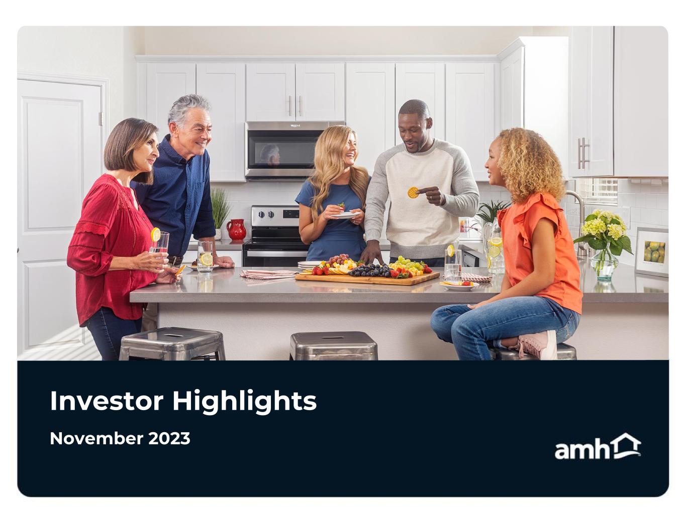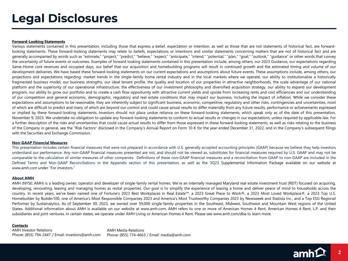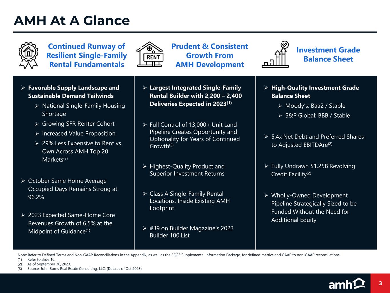 2 Forward-Looking Statements Various statements contained in this presentation, including those that express a belief, expectation or intention, as well as those that are not statements of historical fact, are forward- looking statements. These forward-looking statements may relate to beliefs, expectations or intentions and similar statements concerning matters that are not of historical fact and are generally accompanied by words such as “estimate,” “project,” “predict,” “believe,” “expect,” “anticipate,” “intend,” “potential,” “plan,” “goal,” “outlook,” “guidance” or other words that convey the uncertainty of future events or outcomes. Examples of forward looking statements contained in this presentation include, among others, our 2023 Guidance, our expectations regarding Same-Home core revenues and occupied days, our belief that our acquisition and homebuilding programs will result in continued growth and the estimated timing and volume of our development deliveries. We have based these forward-looking statements on our current expectations and assumptions about future events. These assumptions include, among others, our projections and expectations regarding: market trends in the single-family home rental industry and in the local markets where we operate, our ability to institutionalize a historically fragmented business model, our business strengths, our ideal tenant profile, the quality and location of our properties in attractive neighborhoods, the scale advantage of our national platform and the superiority of our operational infrastructure, the effectiveness of our investment philosophy and diversified acquisition strategy, our ability to expand our development program, our ability to grow our portfolio and to create a cash flow opportunity with attractive current yields and upside from increasing rents and cost efficiencies and our understanding of our competition and general economic, demographic, regulatory and real estate conditions that may impact our business, including the impact of inflation. While we consider these expectations and assumptions to be reasonable, they are inherently subject to significant business, economic, competitive, regulatory and other risks, contingencies and uncertainties, most of which are difficult to predict and many of which are beyond our control and could cause actual results to differ materially from any future results, performance or achievements expressed or implied by these forward-looking statements. Investors should not place undue reliance on these forward-looking statements, which speak only as of the date of this presentation, November 9, 2023. We undertake no obligation to update any forward-looking statements to conform to actual results or changes in our expectations, unless required by applicable law. For a further description of the risks and uncertainties that could cause actual results to differ from those expressed in these forward-looking statements, as well as risks relating to the business of the Company in general, see the “Risk Factors” disclosed in the Company’s Annual Report on Form 10-K for the year ended December 31, 2022, and in the Company’s subsequent filings with the Securities and Exchange Commission. Non-GAAP Financial Measures This presentation includes certain financial measures that were not prepared in accordance with U.S. generally accepted accounting principles (GAAP) because we believe they help investors understand our performance. Any non-GAAP financial measures presented are not, and should not be viewed as, substitutes for financial measures required by U.S. GAAP and may not be comparable to the calculation of similar measures of other companies. Definitions of these non-GAAP financial measures and a reconciliation from GAAP to non-GAAP are included in the Defined Terms and Non-GAAP Reconciliations in the Appendix section of this presentation, as well as the 3Q23 Supplemental Information Package available on our website at www.amh.com under “For Investors.” About AMH AMH (NYSE: AMH) is a leading owner, operator and developer of single-family rental homes. We're an internally managed Maryland real estate investment trust (REIT) focused on acquiring, developing, renovating, leasing and managing homes as rental properties. Our goal is to simplify the experience of leasing a home and deliver peace of mind to households across the country. In recent years, we've been named one of Fortune's 2023 Best Workplaces in Real Estate™, a 2023 Great Place to Work®, a 2023 Most Loved Workplace®, a 2023 Top U.S. Homebuilder by Builder100, one of America's Most Responsible Companies 2023 and America's Most Trustworthy Companies 2023 by Newsweek and Statista Inc., and a Top ESG Regional Performer by Sustainalytics. As of September 30, 2023, we owned over 59,000 single-family properties in the Southeast, Midwest, Southwest and Mountain West regions of the United States. Additional information about AMH is available on our website at www.amh.com. AMH refers to one or more of American Homes 4 Rent, American Homes 4 Rent, L.P. and their subsidiaries and joint ventures. In certain states, we operate under AMH Living or American Homes 4 Rent. Please see www.amh.com/dba to learn more. Contacts AMH Investor Relations Phone: (855) 794-2447 / Email: investors@amh.com AMH Media Relations Phone: (855) 774-4663 / Email: media@amh.com Legal Disclosures