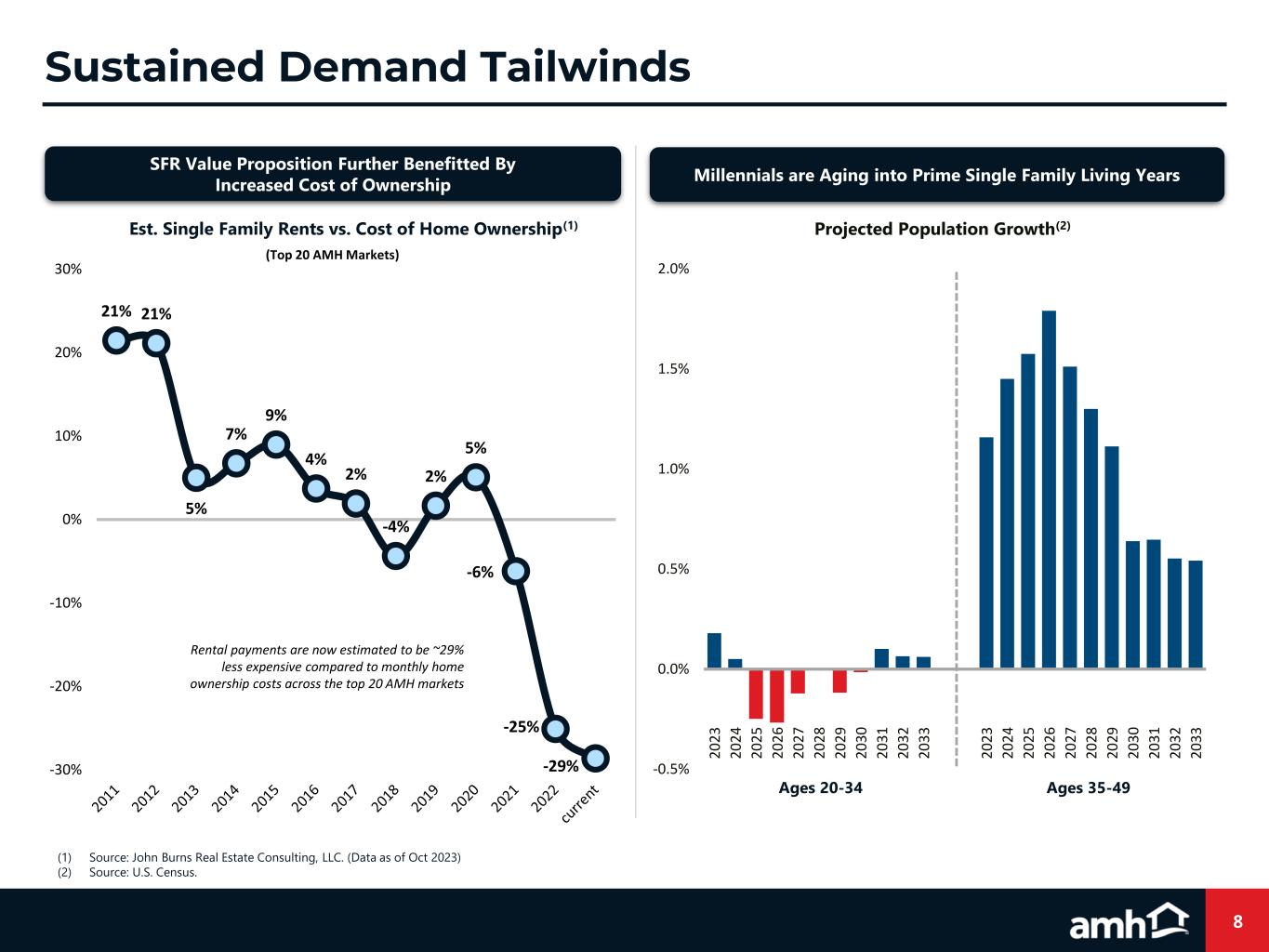 0.0 0.4 0.8 1.2 1.6 2.0 2 0 0 0 2 0 0 1 2 0 0 2 2 0 0 3 2 0 0 4 2 0 0 5 2 0 0 6 2 0 0 7 2 0 0 8 2 0 0 9 2 0 1 0 2 0 1 1 2 0 1 2 2 0 1 3 2 0 1 4 2 0 1 5 2 0 1 6 2 0 1 7 2 0 1 8 2 0 1 9 2 0 2 0 2 0 2 1 2 0 2 2 2 0 2 3 P 2 0 2 4 P 2 0 2 5 P 2 0 2 6 P Single-Family Permits(2) (MM) 7 Favorable Supply Landscape (1) Source: National Association of Realtors. (2) Source: U.S. Census; John Burns Real Estate Consulting, LLC. (Data as of Oct. 2023) Single-Family permit estimates are expected to remain at or below 2022 levels for the next four years – likely not enough to solve the existing housing shortage (2) Historically Low Existing Home Inventories Have Led to Supply Constraints Expected New Construction Levels Likely not Enough to Solve the Country’s Housing Shortage Existing home inventory levels have normalized at ~50% below the long-term average due, in part, to homeowners locked into low-rate mortgages 0.8 1.3 1.8 2.3 2.8 3.3 TTM Avg. National Existing Home Inventory(1) (MM)
