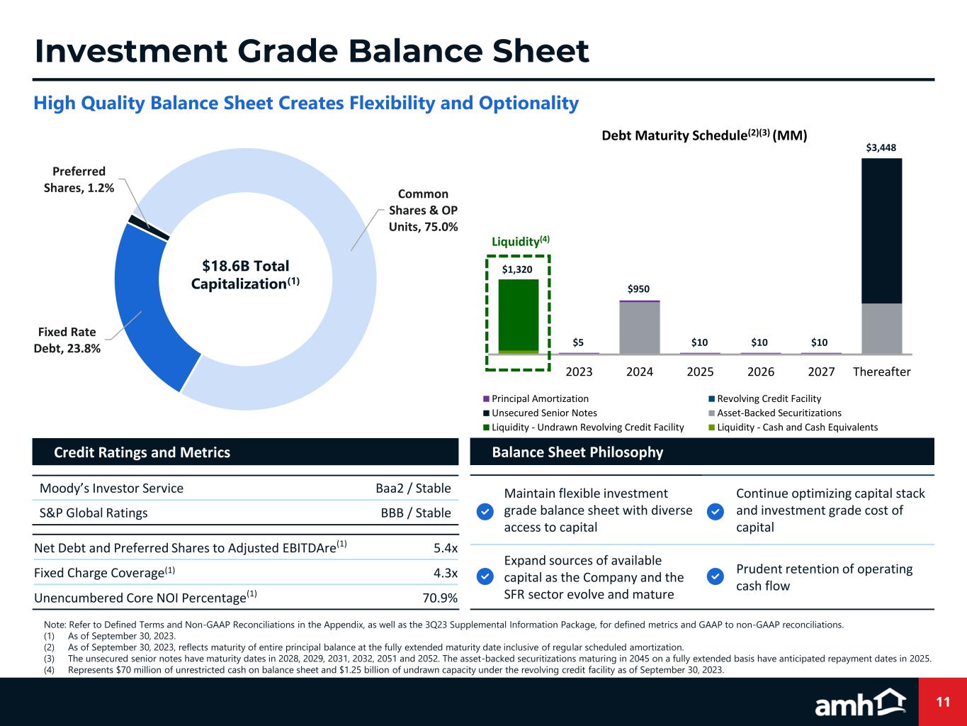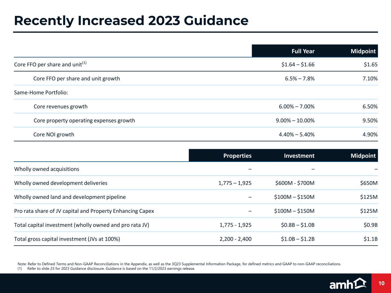 10 Recently Increased 2023 Guidance Note: Refer to Defined Terms and Non-GAAP Reconciliations in the Appendix, as well as the 3Q23 Supplemental Information Package, for defined metrics and GAAP to non-GAAP reconciliations. (1) Refer to slide 23 for 2023 Guidance disclosure. Guidance is based on the 11/2/2023 earnings release. Full Year Midpoint. Core FFO per share and unit(1) $1.64 – $1.66 $1.65 Core FFO per share and unit growth 6.5% – 7.8% 7.10% Same-Home Portfolio: Core revenues growth 6.00% – 7.00% 6.50% Core property operating expenses growth 9.00% – 10.00% 9.50% Core NOI growth 4.40% – 5.40% 4.90% Properties Investment Midpoint. Wholly owned acquisitions – – – Wholly owned development deliveries 1,775 – 1,925 $600M - $700M $650M Wholly owned land and development pipeline – $100M – $150M $125M Pro rata share of JV capital and Property Enhancing Capex – $100M – $150M $125M Total capital investment (wholly owned and pro rata JV) 1,775 - 1,925 $0.8B – $1.0B $0.9B Total gross capital investment (JVs at 100%) 2,200 - 2,400 $1.0B – $1.2B $1.1B