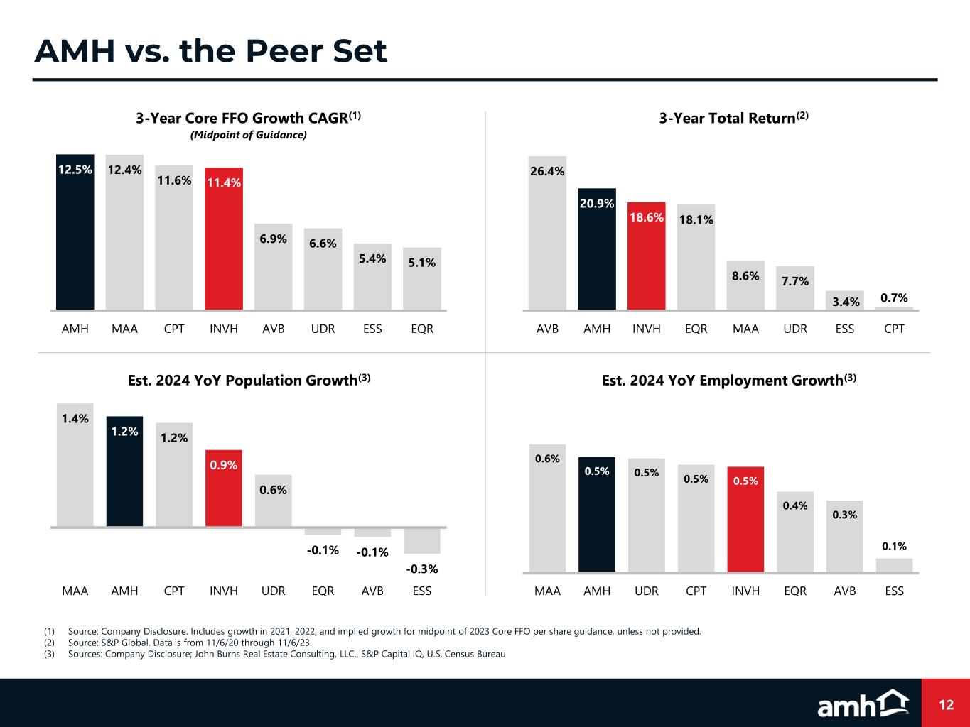 Fixed Rate Debt, 23.8% Preferred Shares, 1.2% Common Shares & OP Units, 75.0% 2023 2024 2025 2026 2027 Thereafter Debt Maturity Schedule(2)(3) (MM) Principal Amortization Revolving Credit Facility Unsecured Senior Notes Asset-Backed Securitizations Liquidity - Undrawn Revolving Credit Facility Liquidity - Cash and Cash Equivalents 11 Investment Grade Balance Sheet High Quality Balance Sheet Creates Flexibility and Optionality Credit Ratings and Metrics Moody’s Investor Service Baa2 / Stable S&P Global Ratings BBB / Stable Balance Sheet Philosophy Maintain flexible investment grade balance sheet with diverse access to capital Continue optimizing capital stack and investment grade cost of capital Expand sources of available capital as the Company and the SFR sector evolve and mature Prudent retention of operating cash flow Note: Refer to Defined Terms and Non-GAAP Reconciliations in the Appendix, as well as the 3Q23 Supplemental Information Package, for defined metrics and GAAP to non-GAAP reconciliations. (1) As of September 30, 2023. (2) As of September 30, 2023, reflects maturity of entire principal balance at the fully extended maturity date inclusive of regular scheduled amortization. (3) The unsecured senior notes have maturity dates in 2028, 2029, 2031, 2032, 2051 and 2052. The asset-backed securitizations maturing in 2045 on a fully extended basis have anticipated repayment dates in 2025. (4) Represents $70 million of unrestricted cash on balance sheet and $1.25 billion of undrawn capacity under the revolving credit facility as of September 30, 2023. Net Debt and Preferred Shares to Adjusted EBITDAre(1) 5.4x Fixed Charge Coverage(1) 4.3x Unencumbered Core NOI Percentage(1) 70.9% $3,448 $5 $950 $10$10 $10 $18.6B Total Capitalization(1) $1,320 Liquidity(4)