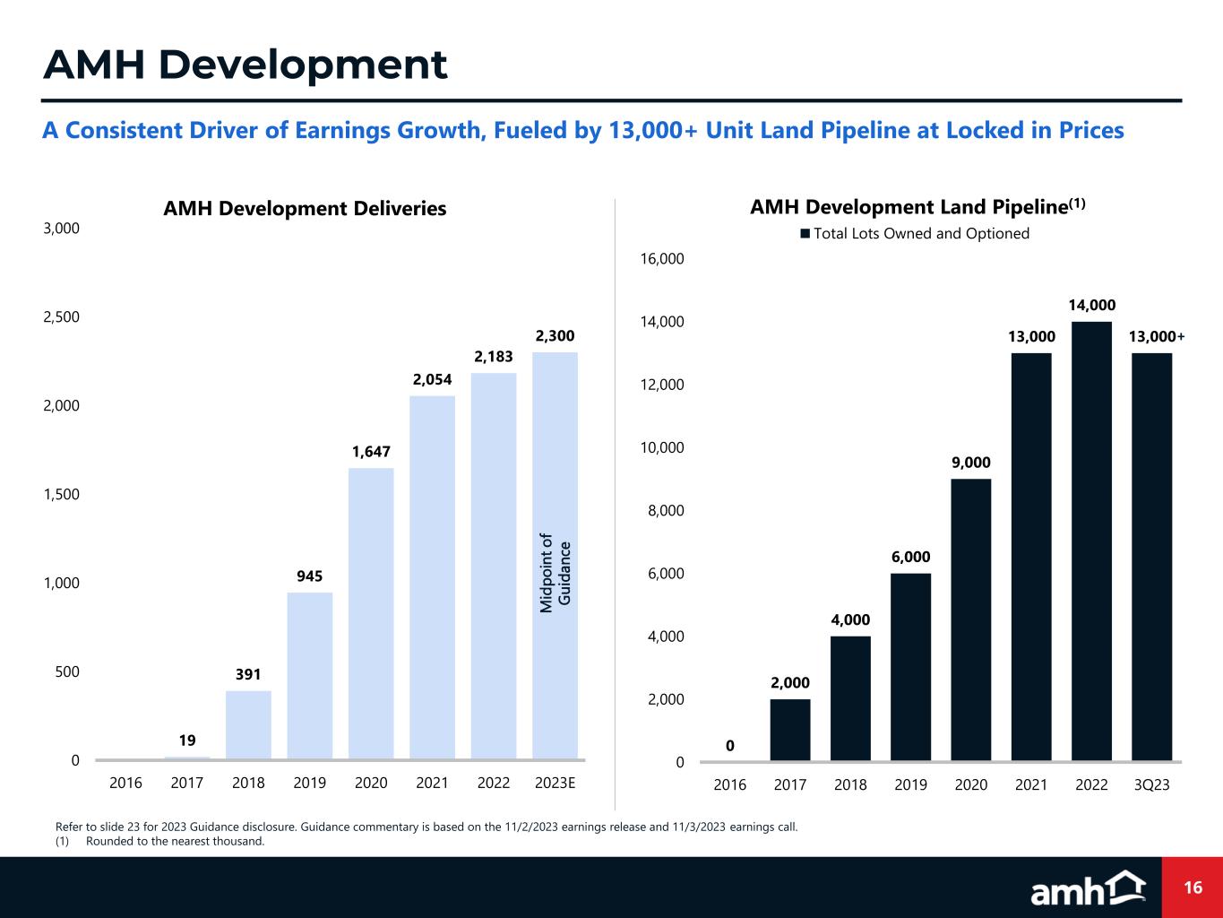 15 Strategy Design and create ideal rental Homes and Communities using data and insights from AMH’s integrated development and operating platforms Less opportunity for alignment of interests between developer and operators Product Type & Location High-quality, detached, single family homes, with attached garages in highly desirable neighborhoods Horizontal apartments, townhomes or detached homes, commonly in tertiary neighborhoods Home Quality Stylish, upgraded fixtures and finishes: granite, hard surface flooring, stainless steel appliances Often “builder basic” or lower quality fixtures and finishes Expense Efficiency Consistent, repeatable floorplans, fixtures and finishes selected for long-term operating expenditure efficiency Varied floorplans, finishes and fixtures, typically selected for lowest up-front cost Value Creation AMH homes are constructed at significant discount to market value, resulting in immediate value creation Commonly purchased at or near market value     AMH Amenity Centers create a community feel for residents AMH Development Homes average 2,000 sq. ft. and come with private yards and fences Other BTR Product AMH Development: Not All BTR is the Same Building the Ideal Rental Home Through the Lens of our Best-In-Class Operating Platform