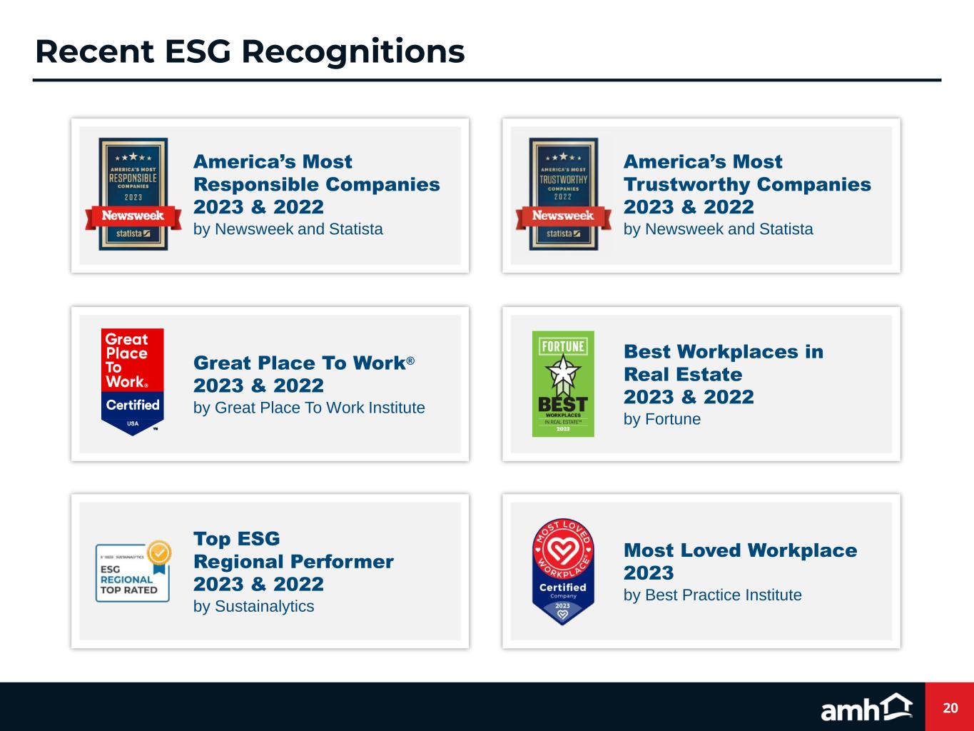 Great Place To Work® 2023 & 2022 by Great Place To Work Institute America’s Most Trustworthy Companies 2023 & 2022 by Newsweek and Statista 20 Recent ESG Recognitions Best Workplaces in Real Estate 2023 & 2022 by Fortune Top ESG Regional Performer 2023 & 2022 by Sustainalytics America’s Most Responsible Companies 2023 & 2022 by Newsweek and Statista TM Most Loved Workplace 2023 by Best Practice Institute