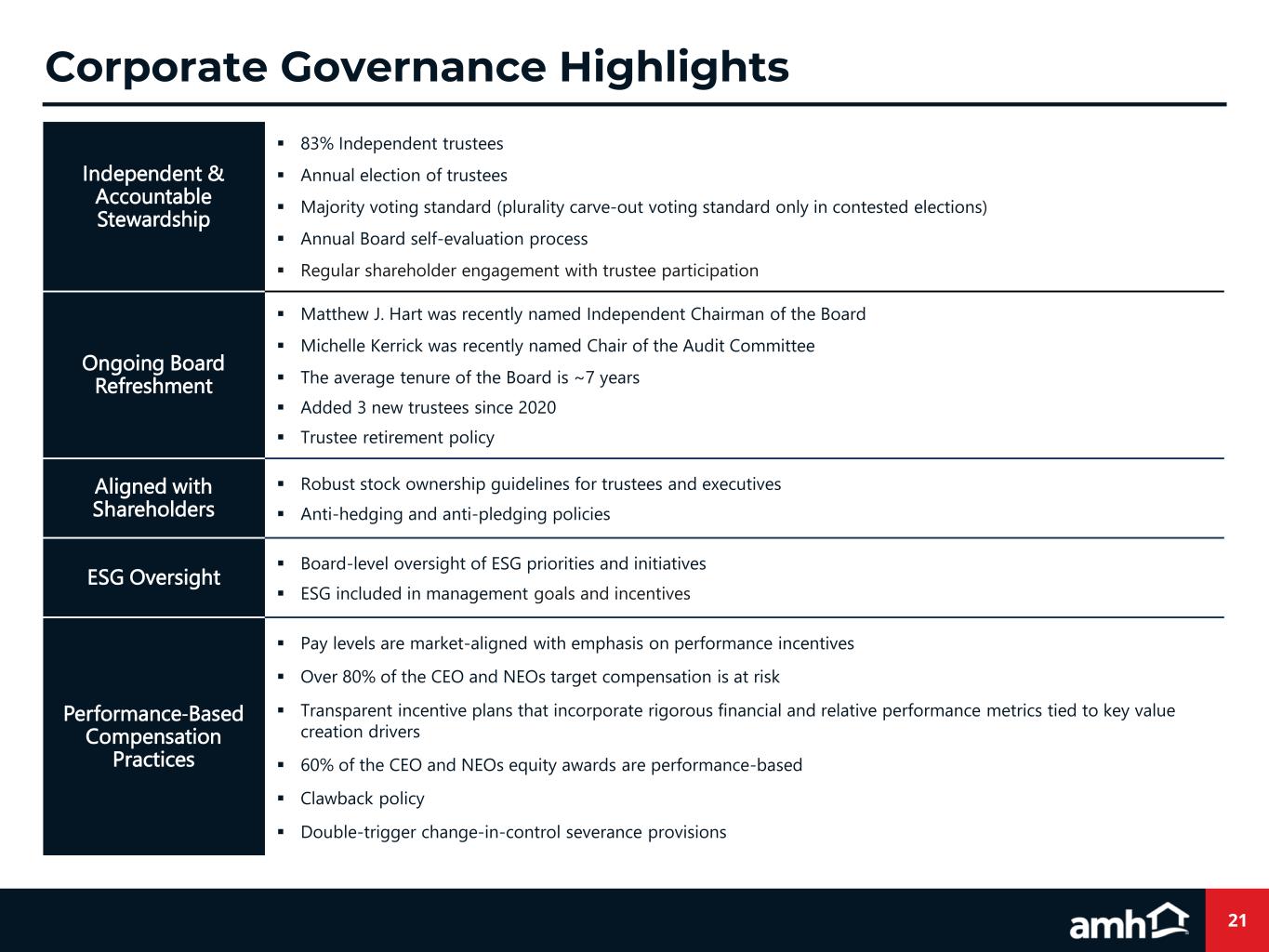 21 Independent & Accountable Stewardship ▪ 83% Independent trustees ▪ Annual election of trustees ▪ Majority voting standard (plurality carve‐out voting standard only in contested elections) ▪ Annual Board self-evaluation process ▪ Regular shareholder engagement with trustee participation Ongoing Board Refreshment ▪ Matthew J. Hart was recently named Independent Chairman of the Board ▪ Michelle Kerrick was recently named Chair of the Audit Committee ▪ The average tenure of the Board is ~7 years ▪ Added 3 new trustees since 2020 ▪ Trustee retirement policy Aligned with Shareholders ▪ Robust stock ownership guidelines for trustees and executives ▪ Anti-hedging and anti-pledging policies ESG Oversight ▪ Board-level oversight of ESG priorities and initiatives ▪ ESG included in management goals and incentives Performance-Based Compensation Practices ▪ Pay levels are market-aligned with emphasis on performance incentives ▪ Over 80% of the CEO and NEOs target compensation is at risk ▪ Transparent incentive plans that incorporate rigorous financial and relative performance metrics tied to key value creation drivers ▪ 60% of the CEO and NEOs equity awards are performance-based ▪ Clawback policy ▪ Double-trigger change-in-control severance provisions Corporate Governance Highlights