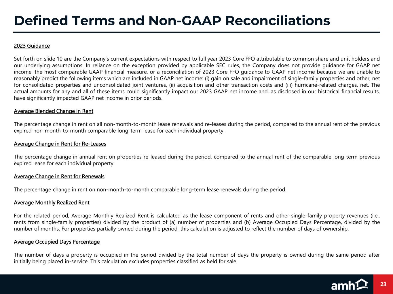 23 2023 Guidance Set forth on slide 10 are the Company’s current expectations with respect to full year 2023 Core FFO attributable to common share and unit holders and our underlying assumptions. In reliance on the exception provided by applicable SEC rules, the Company does not provide guidance for GAAP net income, the most comparable GAAP financial measure, or a reconciliation of 2023 Core FFO guidance to GAAP net income because we are unable to reasonably predict the following items which are included in GAAP net income: (i) gain on sale and impairment of single-family properties and other, net for consolidated properties and unconsolidated joint ventures, (ii) acquisition and other transaction costs and (iii) hurricane-related charges, net. The actual amounts for any and all of these items could significantly impact our 2023 GAAP net income and, as disclosed in our historical financial results, have significantly impacted GAAP net income in prior periods. Average Blended Change in Rent The percentage change in rent on all non-month-to-month lease renewals and re-leases during the period, compared to the annual rent of the previous expired non-month-to-month comparable long-term lease for each individual property. Average Change in Rent for Re-Leases The percentage change in annual rent on properties re-leased during the period, compared to the annual rent of the comparable long-term previous expired lease for each individual property. Average Change in Rent for Renewals The percentage change in rent on non-month-to-month comparable long-term lease renewals during the period. Average Monthly Realized Rent For the related period, Average Monthly Realized Rent is calculated as the lease component of rents and other single-family property revenues (i.e., rents from single-family properties) divided by the product of (a) number of properties and (b) Average Occupied Days Percentage, divided by the number of months. For properties partially owned during the period, this calculation is adjusted to reflect the number of days of ownership. Average Occupied Days Percentage The number of days a property is occupied in the period divided by the total number of days the property is owned during the same period after initially being placed in-service. This calculation excludes properties classified as held for sale. Defined Terms and Non-GAAP Reconciliations