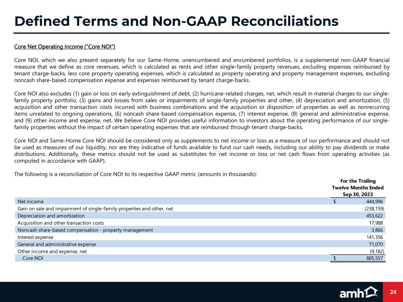 24 Defined Terms and Non-GAAP Reconciliations Core Net Operating Income ("Core NOI“) Core NOI, which we also present separately for our Same-Home, unencumbered and encumbered portfolios, is a supplemental non-GAAP financial measure that we define as core revenues, which is calculated as rents and other single-family property revenues, excluding expenses reimbursed by tenant charge-backs, less core property operating expenses, which is calculated as property operating and property management expenses, excluding noncash share-based compensation expense and expenses reimbursed by tenant charge-backs. Core NOI also excludes (1) gain or loss on early extinguishment of debt, (2) hurricane-related charges, net, which result in material charges to our single- family property portfolio, (3) gains and losses from sales or impairments of single-family properties and other, (4) depreciation and amortization, (5) acquisition and other transaction costs incurred with business combinations and the acquisition or disposition of properties as well as nonrecurring items unrelated to ongoing operations, (6) noncash share-based compensation expense, (7) interest expense, (8) general and administrative expense, and (9) other income and expense, net. We believe Core NOI provides useful information to investors about the operating performance of our single- family properties without the impact of certain operating expenses that are reimbursed through tenant charge-backs. Core NOI and Same-Home Core NOI should be considered only as supplements to net income or loss as a measure of our performance and should not be used as measures of our liquidity, nor are they indicative of funds available to fund our cash needs, including our ability to pay dividends or make distributions. Additionally, these metrics should not be used as substitutes for net income or loss or net cash flows from operating activities (as computed in accordance with GAAP). The following is a reconciliation of Core NOI to its respective GAAP metric (amounts in thousands): Net income 444,996$ Gain on sale and impairment of single-family properties and other, net (238,159) Depreciation and amortization 453,622 Acquisition and other transaction costs 17,988 Noncash share-based compensation - property management 3,866 Interest expense 141,356 General and administrative expense 71,070 Other income and expense, net (9,182) Core NOI 885,557$ For the Trailing Twelve Months Ended Sep 30, 2023