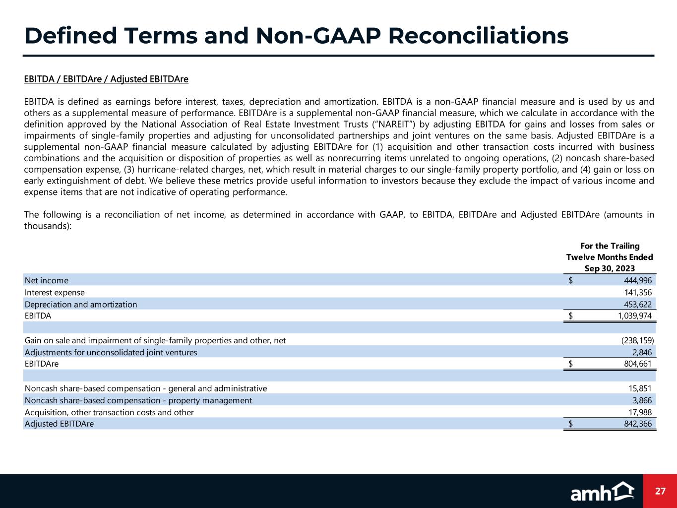 27 EBITDA / EBITDAre / Adjusted EBITDAre EBITDA is defined as earnings before interest, taxes, depreciation and amortization. EBITDA is a non-GAAP financial measure and is used by us and others as a supplemental measure of performance. EBITDAre is a supplemental non-GAAP financial measure, which we calculate in accordance with the definition approved by the National Association of Real Estate Investment Trusts (“NAREIT”) by adjusting EBITDA for gains and losses from sales or impairments of single-family properties and adjusting for unconsolidated partnerships and joint ventures on the same basis. Adjusted EBITDAre is a supplemental non-GAAP financial measure calculated by adjusting EBITDAre for (1) acquisition and other transaction costs incurred with business combinations and the acquisition or disposition of properties as well as nonrecurring items unrelated to ongoing operations, (2) noncash share-based compensation expense, (3) hurricane-related charges, net, which result in material charges to our single-family property portfolio, and (4) gain or loss on early extinguishment of debt. We believe these metrics provide useful information to investors because they exclude the impact of various income and expense items that are not indicative of operating performance. The following is a reconciliation of net income, as determined in accordance with GAAP, to EBITDA, EBITDAre and Adjusted EBITDAre (amounts in thousands): For the Trailing Twelve Months Ended Sep 30, 2023 Net income 444,996$ Interest expense 141,356 Depreciation and amortization 453,622 EBITDA 1,039,974$ Gain on sale and impairment of single-family properties and other, net (238,159) Adjustments for unconsolidated joint ventures 2,846 EBITDAre 804,661$ Noncash share-based compensation - general and administrative 15,851 Noncash share-based compensation - property management 3,866 Acquisition, other transaction costs and other 17,988 Adjusted EBITDAre 842,366$ Defined Terms and Non-GAAP Reconciliations