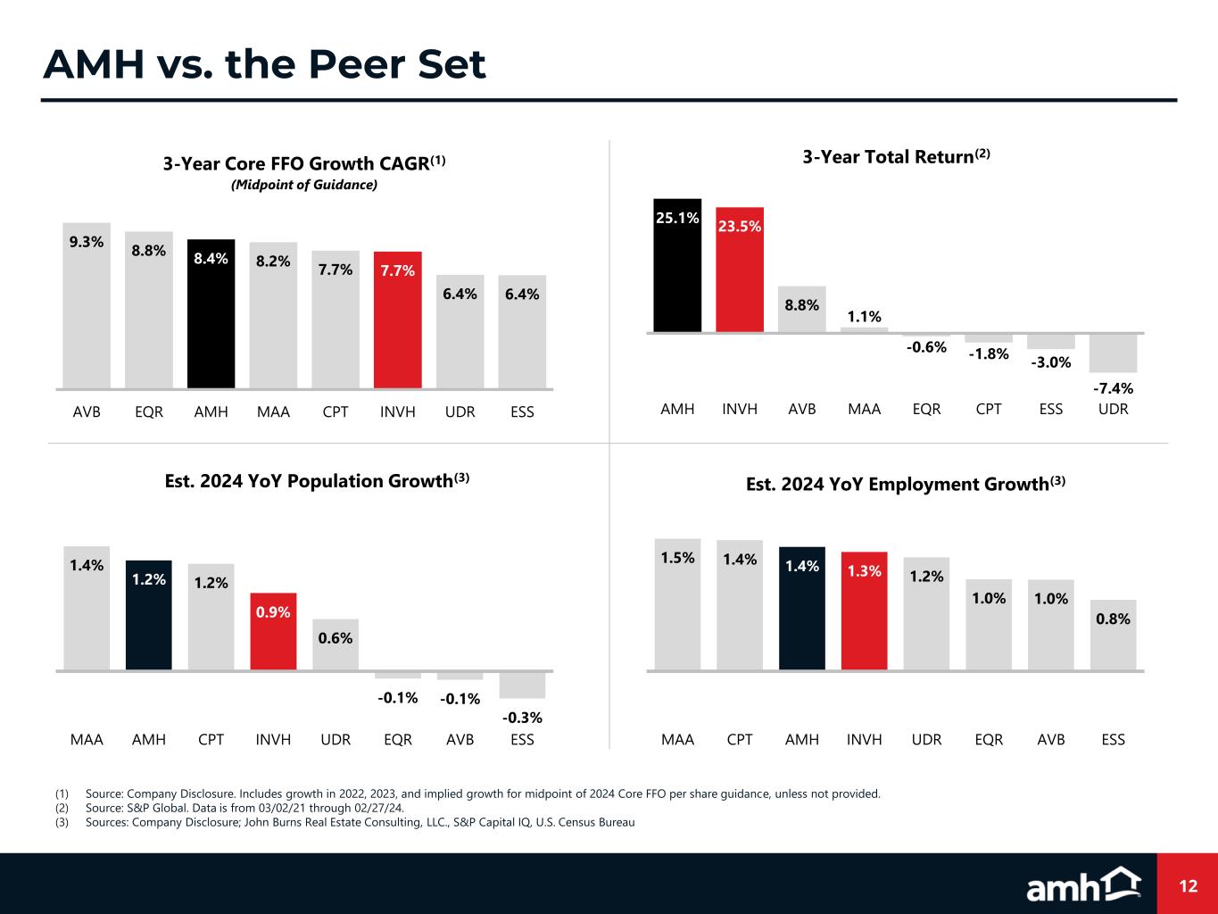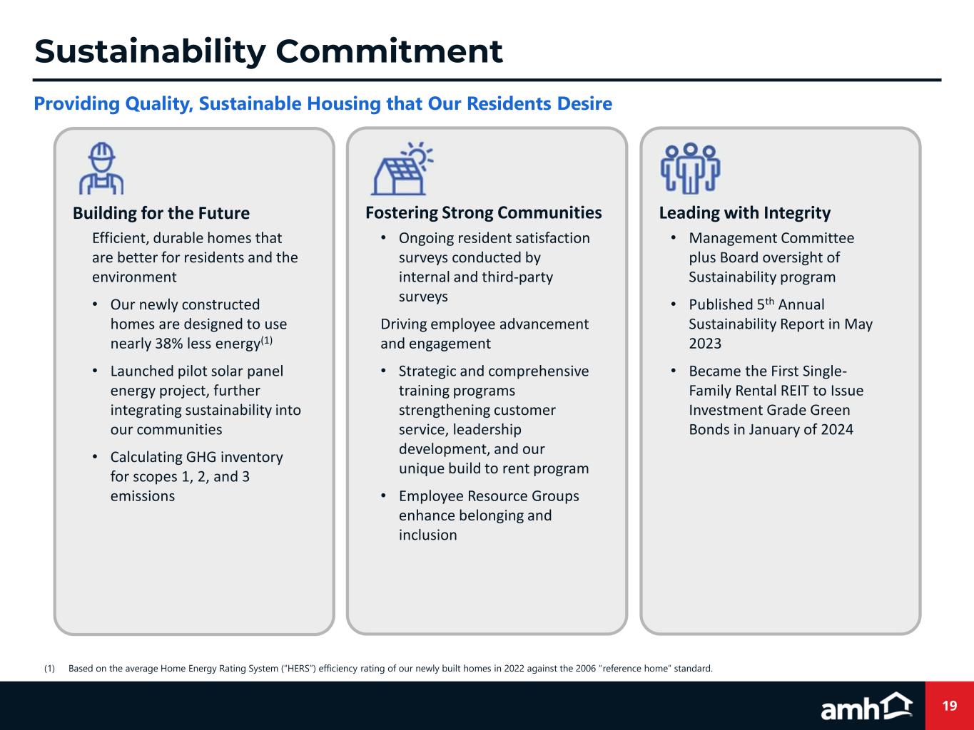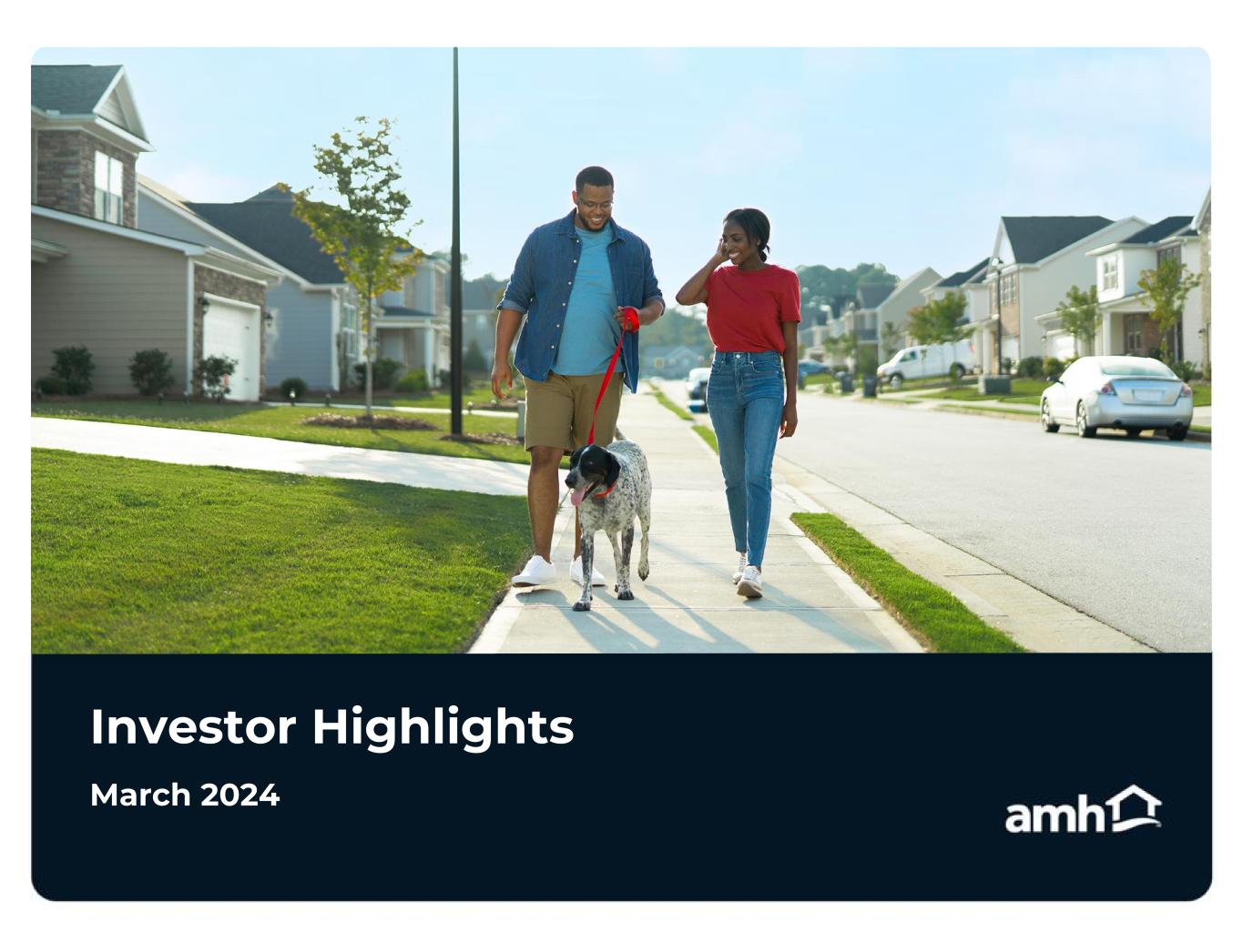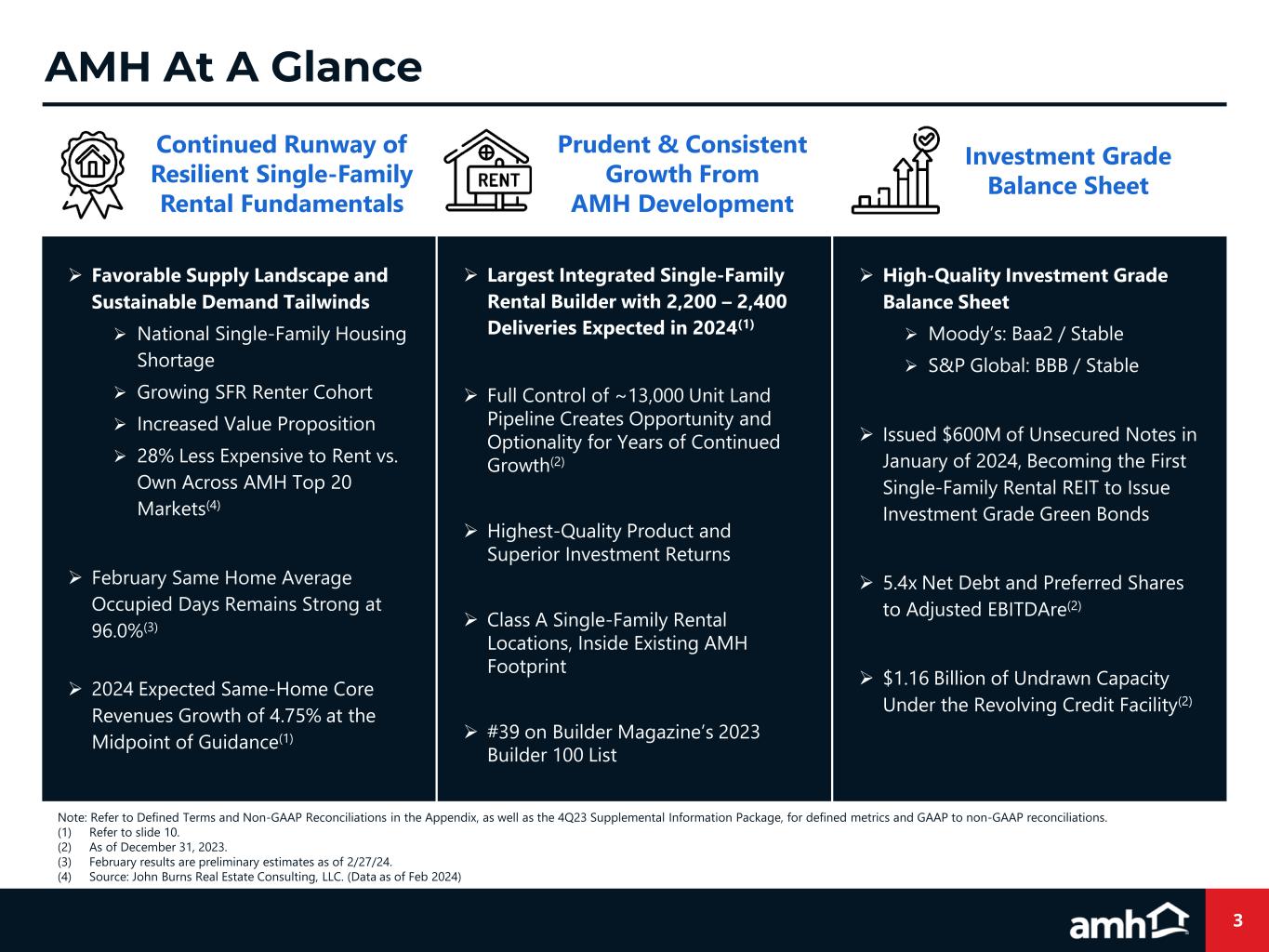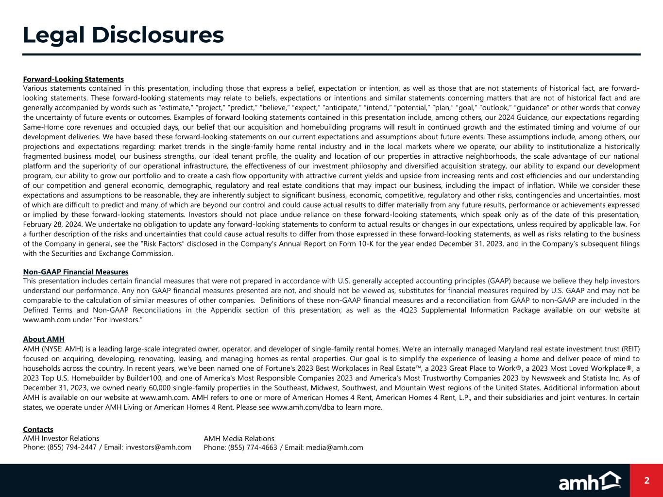 2 Forward-Looking Statements Various statements contained in this presentation, including those that express a belief, expectation or intention, as well as those that are not statements of historical fact, are forward- looking statements. These forward-looking statements may relate to beliefs, expectations or intentions and similar statements concerning matters that are not of historical fact and are generally accompanied by words such as “estimate,” “project,” “predict,” “believe,” “expect,” “anticipate,” “intend,” “potential,” “plan,” “goal,” “outlook,” “guidance” or other words that convey the uncertainty of future events or outcomes. Examples of forward looking statements contained in this presentation include, among others, our 2024 Guidance, our expectations regarding Same-Home core revenues and occupied days, our belief that our acquisition and homebuilding programs will result in continued growth and the estimated timing and volume of our development deliveries. We have based these forward-looking statements on our current expectations and assumptions about future events. These assumptions include, among others, our projections and expectations regarding: market trends in the single-family home rental industry and in the local markets where we operate, our ability to institutionalize a historically fragmented business model, our business strengths, our ideal tenant profile, the quality and location of our properties in attractive neighborhoods, the scale advantage of our national platform and the superiority of our operational infrastructure, the effectiveness of our investment philosophy and diversified acquisition strategy, our ability to expand our development program, our ability to grow our portfolio and to create a cash flow opportunity with attractive current yields and upside from increasing rents and cost efficiencies and our understanding of our competition and general economic, demographic, regulatory and real estate conditions that may impact our business, including the impact of inflation. While we consider these expectations and assumptions to be reasonable, they are inherently subject to significant business, economic, competitive, regulatory and other risks, contingencies and uncertainties, most of which are difficult to predict and many of which are beyond our control and could cause actual results to differ materially from any future results, performance or achievements expressed or implied by these forward-looking statements. Investors should not place undue reliance on these forward-looking statements, which speak only as of the date of this presentation, February 28, 2024. We undertake no obligation to update any forward-looking statements to conform to actual results or changes in our expectations, unless required by applicable law. For a further description of the risks and uncertainties that could cause actual results to differ from those expressed in these forward-looking statements, as well as risks relating to the business of the Company in general, see the “Risk Factors” disclosed in the Company’s Annual Report on Form 10-K for the year ended December 31, 2023, and in the Company’s subsequent filings with the Securities and Exchange Commission. Non-GAAP Financial Measures This presentation includes certain financial measures that were not prepared in accordance with U.S. generally accepted accounting principles (GAAP) because we believe they help investors understand our performance. Any non-GAAP financial measures presented are not, and should not be viewed as, substitutes for financial measures required by U.S. GAAP and may not be comparable to the calculation of similar measures of other companies. Definitions of these non-GAAP financial measures and a reconciliation from GAAP to non-GAAP are included in the Defined Terms and Non-GAAP Reconciliations in the Appendix section of this presentation, as well as the 4Q23 Supplemental Information Package available on our website at www.amh.com under “For Investors.” About AMH AMH (NYSE: AMH) is a leading large-scale integrated owner, operator, and developer of single-family rental homes. We're an internally managed Maryland real estate investment trust (REIT) focused on acquiring, developing, renovating, leasing, and managing homes as rental properties. Our goal is to simplify the experience of leasing a home and deliver peace of mind to households across the country. In recent years, we've been named one of Fortune's 2023 Best Workplaces in Real Estate , a 2023 Great Place to Work®, a 2023 Most Loved Workplace®, a 2023 Top U.S. Homebuilder by Builder100, and one of America's Most Responsible Companies 2023 and America's Most Trustworthy Companies 2023 by Newsweek and Statista Inc. As of December 31, 2023, we owned nearly 60,000 single-family properties in the Southeast, Midwest, Southwest, and Mountain West regions of the United States. Additional information about AMH is available on our website at www.amh.com. AMH refers to one or more of American Homes 4 Rent, American Homes 4 Rent, L.P., and their subsidiaries and joint ventures. In certain states, we operate under AMH Living or American Homes 4 Rent. Please see www.amh.com/dba to learn more. Contacts AMH Investor Relations Phone: (855) 794-2447 / Email: investors@amh.com AMH Media Relations Phone: (855) 774-4663 / Email: media@amh.com Legal Disclosures