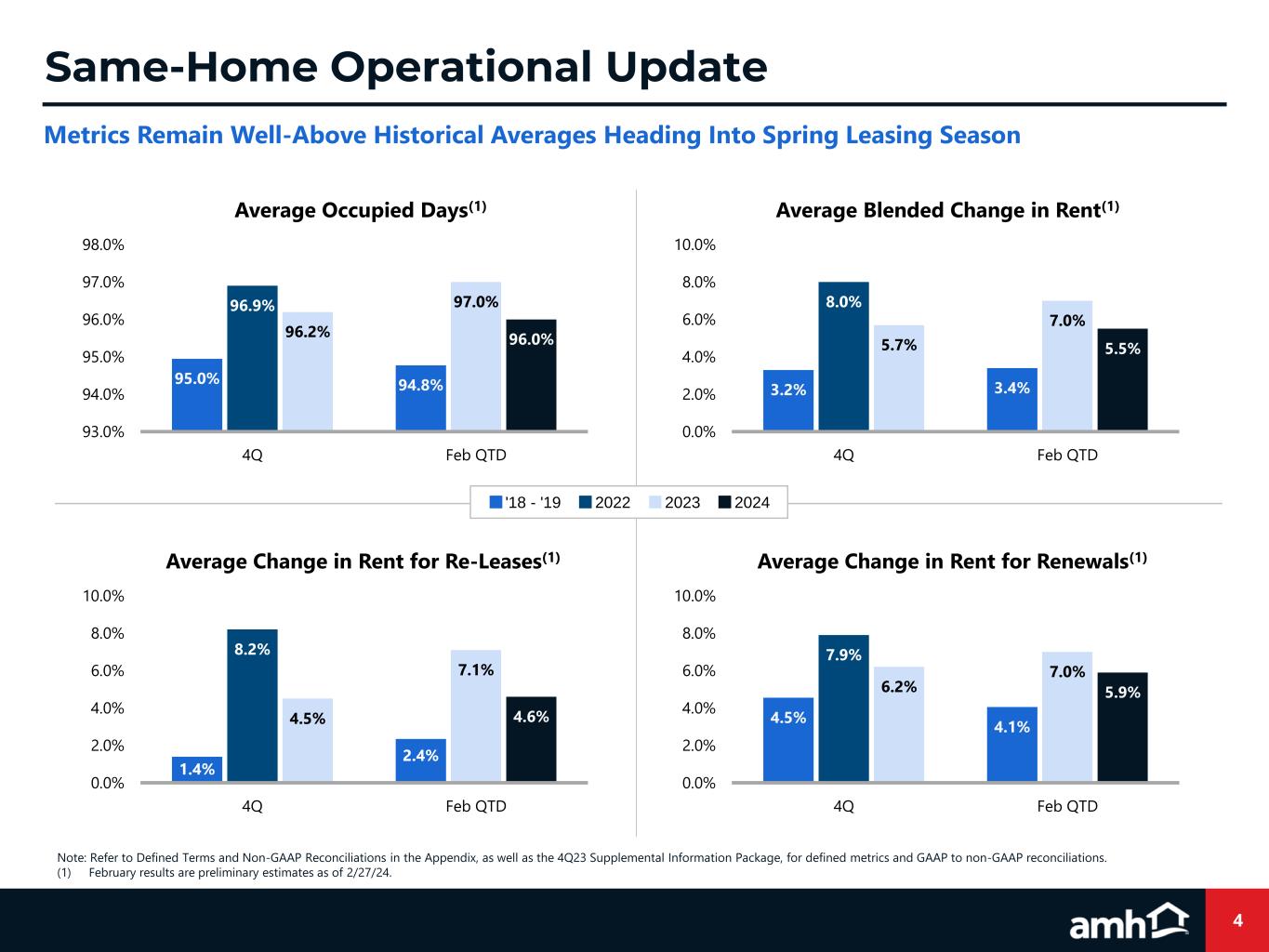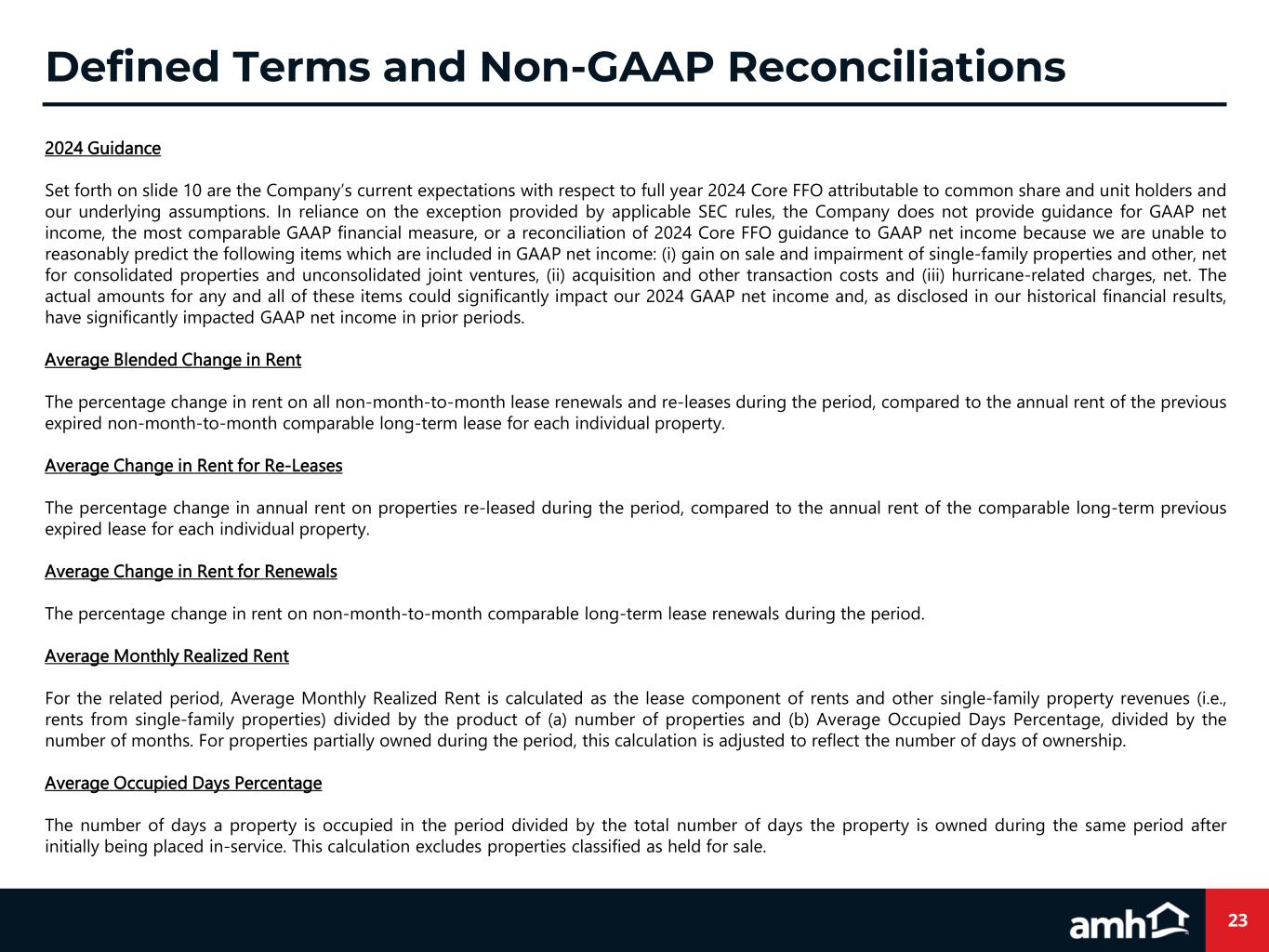 23 2024 Guidance Set forth on slide 10 are the Company’s current expectations with respect to full year 2024 Core FFO attributable to common share and unit holders and our underlying assumptions. In reliance on the exception provided by applicable SEC rules, the Company does not provide guidance for GAAP net income, the most comparable GAAP financial measure, or a reconciliation of 2024 Core FFO guidance to GAAP net income because we are unable to reasonably predict the following items which are included in GAAP net income: (i) gain on sale and impairment of single-family properties and other, net for consolidated properties and unconsolidated joint ventures, (ii) acquisition and other transaction costs and (iii) hurricane-related charges, net. The actual amounts for any and all of these items could significantly impact our 2024 GAAP net income and, as disclosed in our historical financial results, have significantly impacted GAAP net income in prior periods. Average Blended Change in Rent The percentage change in rent on all non-month-to-month lease renewals and re-leases during the period, compared to the annual rent of the previous expired non-month-to-month comparable long-term lease for each individual property. Average Change in Rent for Re-Leases The percentage change in annual rent on properties re-leased during the period, compared to the annual rent of the comparable long-term previous expired lease for each individual property. Average Change in Rent for Renewals The percentage change in rent on non-month-to-month comparable long-term lease renewals during the period. Average Monthly Realized Rent For the related period, Average Monthly Realized Rent is calculated as the lease component of rents and other single-family property revenues (i.e., rents from single-family properties) divided by the product of (a) number of properties and (b) Average Occupied Days Percentage, divided by the number of months. For properties partially owned during the period, this calculation is adjusted to reflect the number of days of ownership. Average Occupied Days Percentage The number of days a property is occupied in the period divided by the total number of days the property is owned during the same period after initially being placed in-service. This calculation excludes properties classified as held for sale. Defined Terms and Non-GAAP Reconciliations