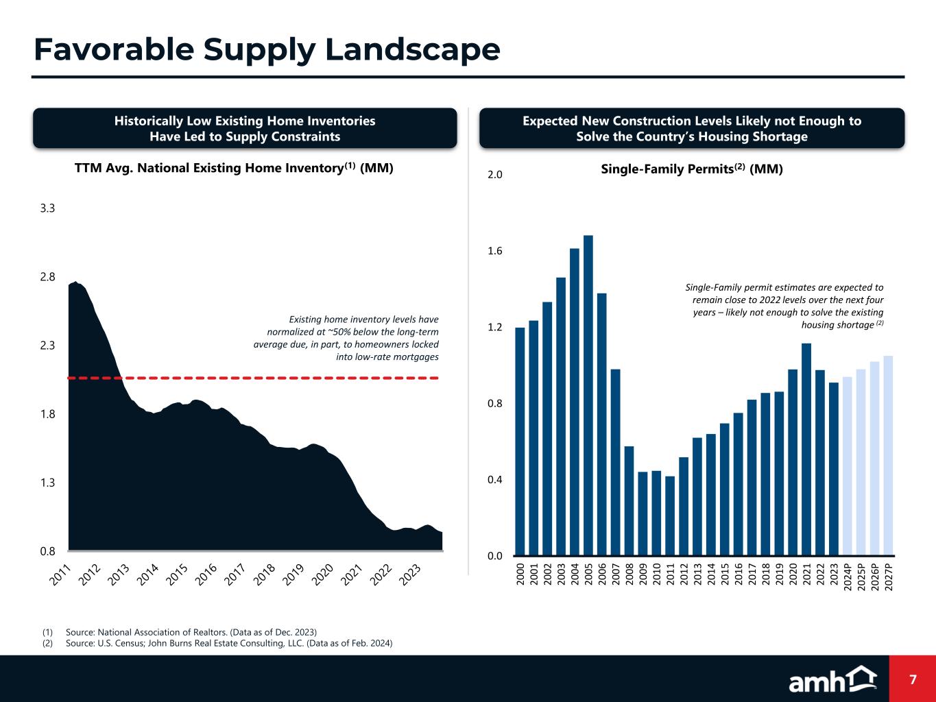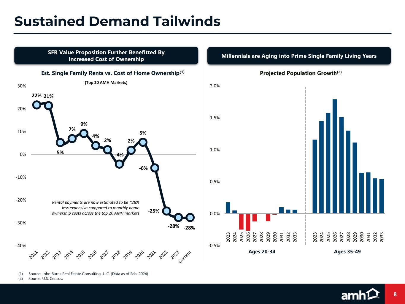 0.0 0.4 0.8 1.2 1.6 2.0 2 0 0 0 2 0 0 1 2 0 0 2 2 0 0 3 2 0 0 4 2 0 0 5 2 0 0 6 2 0 0 7 2 0 0 8 2 0 0 9 2 0 1 0 2 0 1 1 2 0 1 2 2 0 1 3 2 0 1 4 2 0 1 5 2 0 1 6 2 0 1 7 2 0 1 8 2 0 1 9 2 0 2 0 2 0 2 1 2 0 2 2 2 0 2 3 2 0 2 4 P 2 0 2 5 P 2 0 2 6 P 2 0 2 7 P Single-Family Permits(2) (MM) 0.8 1.3 1.8 2.3 2.8 3.3 TTM Avg. National Existing Home Inventory(1) (MM) 7 Favorable Supply Landscape (1) Source: National Association of Realtors. (Data as of Dec. 2023) (2) Source: U.S. Census; John Burns Real Estate Consulting, LLC. (Data as of Feb. 2024) Single-Family permit estimates are expected to remain close to 2022 levels over the next four years – likely not enough to solve the existing housing shortage (2) Historically Low Existing Home Inventories Have Led to Supply Constraints Expected New Construction Levels Likely not Enough to Solve the Country’s Housing Shortage Existing home inventory levels have normalized at ~50% below the long-term average due, in part, to homeowners locked into low-rate mortgages