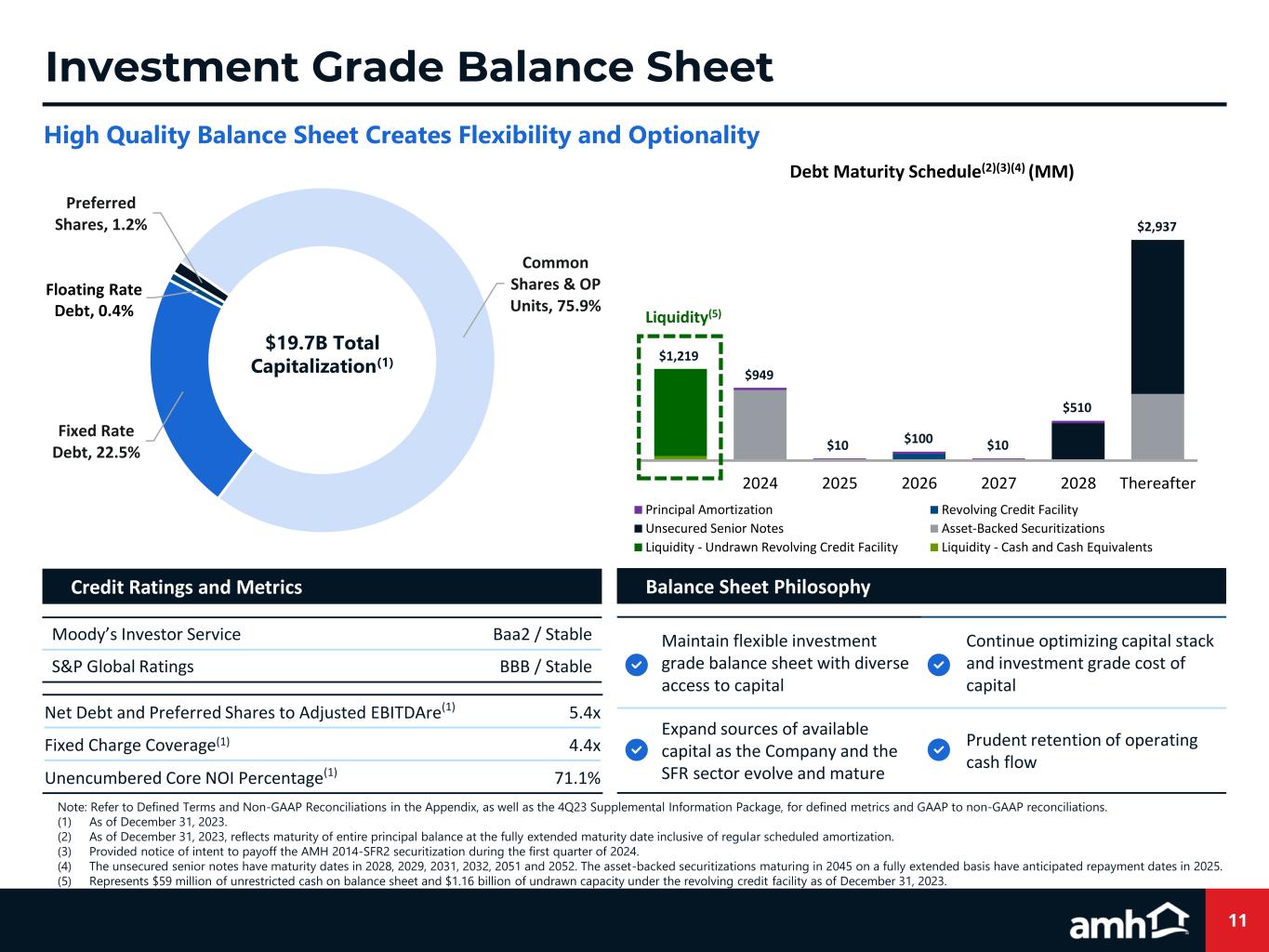 10 2024 Guidance Note: Refer to Defined Terms and Non-GAAP Reconciliations in the Appendix, as well as the 4Q23 Supplemental Information Package, for defined metrics and GAAP to non-GAAP reconciliations. (1) Refer to slide 23 for 2024 Guidance disclosure. Guidance is based on the 2/22/2024 earnings release. Full Year Midpoint. Core FFO per share and unit(1) $1.70 – $1.76 $1.73 Core FFO per share and unit growth 2.4% – 6.0% 4.2% Same-Home Portfolio: Core revenues growth 3.75% – 5.75% 4.75% Core property operating expenses growth 5.25% – 7.25% 6.25% Core NOI growth 3.00% – 5.00% 4.00% Properties Investment Midpoint. Wholly owned acquisitions – – – Wholly owned development deliveries 1,825 – 1,975 $700M - $800M $750M Wholly owned land and development pipeline – $100M – $150M $125M Pro rata share of JV capital and Property Enhancing Capex – $100M – $150M $125M Total capital investment (wholly owned and pro rata JV) 1,825 - 1,975 $0.9B – $1.1B $1.0B Total gross capital investment (JVs at 100%) 2,200 - 2,400 $1.1B – $1.3B $1.2B