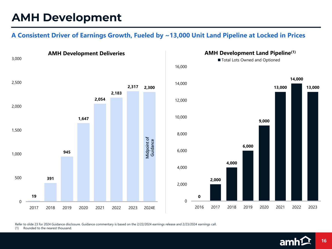 16 AMH Development A Consistent Driver of Earnings Growth, Fueled by ~13,000 Unit Land Pipeline at Locked in Prices Refer to slide 23 for 2024 Guidance disclosure. Guidance commentary is based on the 2/22/2024 earnings release and 2/23/2024 earnings call. (1) Rounded to the nearest thousand. 19 391 945 1,647 2,054 2,183 2,317 2,300 0 500 1,000 1,500 2,000 2,500 3,000 2017 2018 2019 2020 2021 2022 2023 2024E AMH Development Deliveries M id p o in t o f G u id a n ce 0 2,000 4,000 6,000 9,000 13,000 14,000 13,000 0 2,000 4,000 6,000 8,000 10,000 12,000 14,000 16,000 2016 2017 2018 2019 2020 2021 2022 2023 AMH Development Land Pipeline(1) Total Lots Owned and Optioned