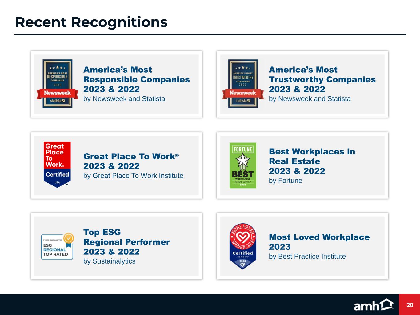 Great Place To Work® 2023 & 2022 by Great Place To Work Institute America’s Most Trustworthy Companies 2023 & 2022 by Newsweek and Statista 20 Recent Recognitions Best Workplaces in Real Estate 2023 & 2022 by Fortune Top ESG Regional Performer 2023 & 2022 by Sustainalytics America’s Most Responsible Companies 2023 & 2022 by Newsweek and Statista TM Most Loved Workplace 2023 by Best Practice Institute