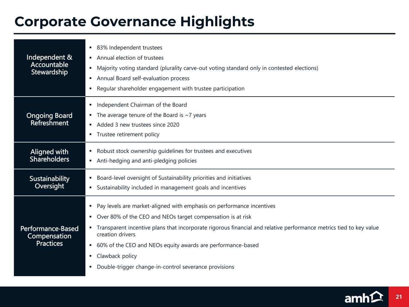 19 Sustainability Commitment Providing Quality, Sustainable Housing that Our Residents Desire Fostering Strong CommunitiesBuilding for the Future Leading with Integrity Efficient, durable homes that are better for residents and the environment • Our newly constructed homes are designed to use nearly 38% less energy(1) • Launched pilot solar panel energy project, further integrating sustainability into our communities • Calculating GHG inventory for scopes 1, 2, and 3 emissions • Ongoing resident satisfaction surveys conducted by internal and third-party surveys Driving employee advancement and engagement • Strategic and comprehensive training programs strengthening customer service, leadership development, and our unique build to rent program • Employee Resource Groups enhance belonging and inclusion • Management Committee plus Board oversight of Sustainability program • Published 5th Annual Sustainability Report in May 2023 • Became the First Single- Family Rental REIT to Issue Investment Grade Green Bonds in January of 2024 (1) Based on the average Home Energy Rating System (“HERS”) efficiency rating of our newly built homes in 2022 against the 2006 “reference home” standard.