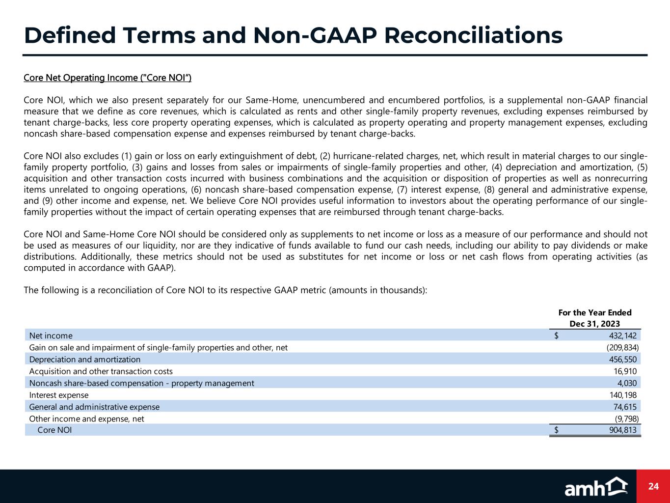 24 Defined Terms and Non-GAAP Reconciliations Core Net Operating Income ("Core NOI“) Core NOI, which we also present separately for our Same-Home, unencumbered and encumbered portfolios, is a supplemental non-GAAP financial measure that we define as core revenues, which is calculated as rents and other single-family property revenues, excluding expenses reimbursed by tenant charge-backs, less core property operating expenses, which is calculated as property operating and property management expenses, excluding noncash share-based compensation expense and expenses reimbursed by tenant charge-backs. Core NOI also excludes (1) gain or loss on early extinguishment of debt, (2) hurricane-related charges, net, which result in material charges to our single- family property portfolio, (3) gains and losses from sales or impairments of single-family properties and other, (4) depreciation and amortization, (5) acquisition and other transaction costs incurred with business combinations and the acquisition or disposition of properties as well as nonrecurring items unrelated to ongoing operations, (6) noncash share-based compensation expense, (7) interest expense, (8) general and administrative expense, and (9) other income and expense, net. We believe Core NOI provides useful information to investors about the operating performance of our single- family properties without the impact of certain operating expenses that are reimbursed through tenant charge-backs. Core NOI and Same-Home Core NOI should be considered only as supplements to net income or loss as a measure of our performance and should not be used as measures of our liquidity, nor are they indicative of funds available to fund our cash needs, including our ability to pay dividends or make distributions. Additionally, these metrics should not be used as substitutes for net income or loss or net cash flows from operating activities (as computed in accordance with GAAP). The following is a reconciliation of Core NOI to its respective GAAP metric (amounts in thousands): Net income 432,142$ Gain on sale and impairment of single-family properties and other, net (209,834) Depreciation and amortization 456,550 Acquisition and other transaction costs 16,910 Noncash share-based compensation - property management 4,030 Interest expense 140,198 General and administrative expense 74,615 Other income and expense, net (9,798) Core NOI 904,813$ For the Year Ended Dec 31, 2023