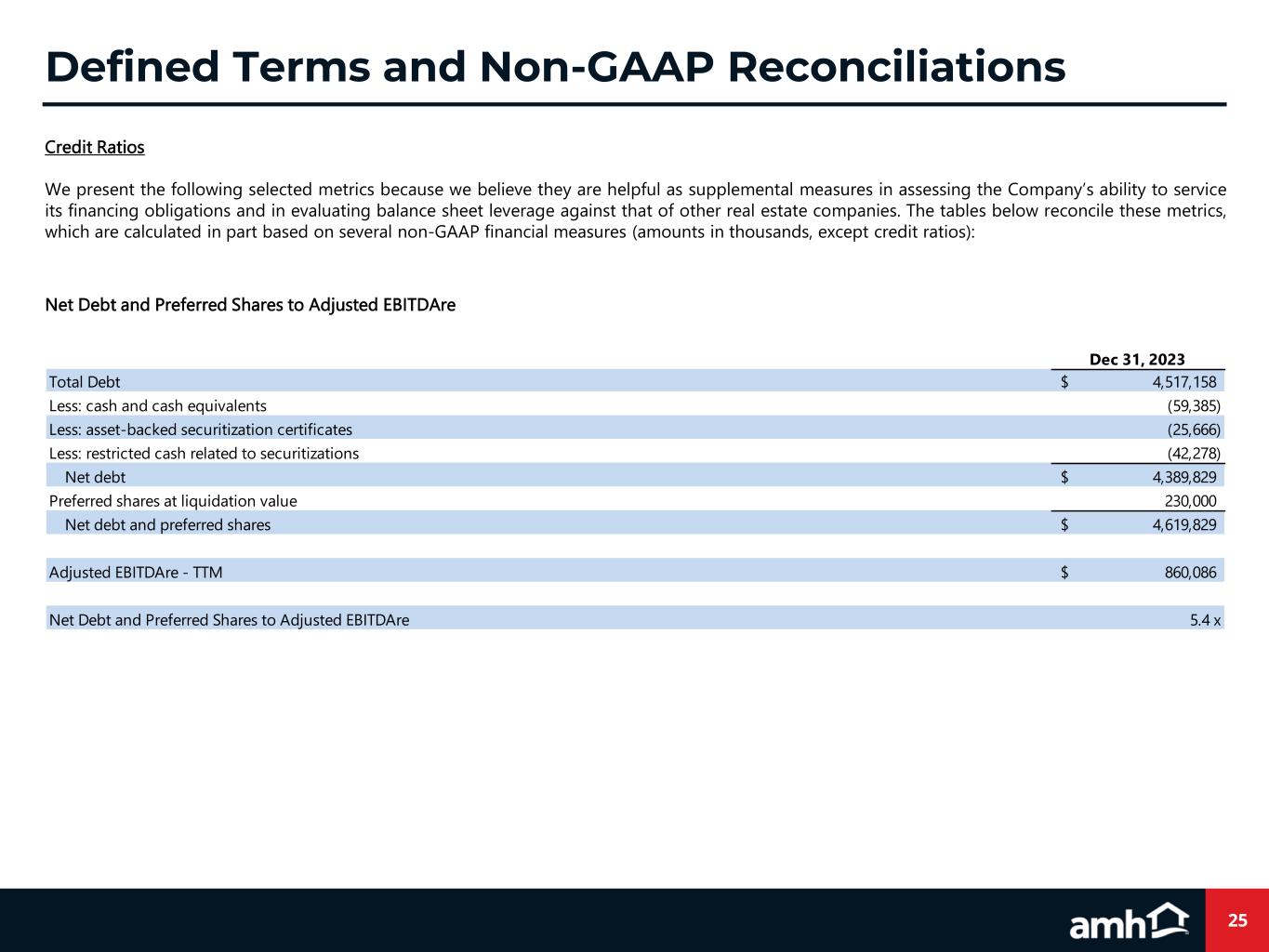 30 Property Enhancing Capex Includes elective capital expenditures to enhance the operating profile of a property, such as investments to increase future revenues or reduce maintenance expenditures. Same-Home Property A property is classified as Same-Home if it has been stabilized longer than 90 days prior to the beginning of the earliest period presented under comparison. A property is removed from Same-Home if it has been classified as held for sale or has experienced a casualty loss. Stabilized Property A property acquired individually (i.e., not through a bulk purchase) is classified as stabilized once it has been renovated by the Company or newly constructed and then initially leased or available for rent for a period greater than 90 days. Properties acquired through a bulk purchase are first considered non-stabilized, as an entire group, until (1) we have owned them for an adequate period of time to allow for complete on-boarding to our operating platform, and (2) a substantial portion of the properties have experienced tenant turnover at least once under our ownership, providing the opportunity for renovations and improvements to meet our property standards. After such time has passed, properties acquired through a bulk purchase are then evaluated on an individual property basis under our standard stabilization criteria. Total Capitalization Includes the market value of all outstanding common shares and operating partnership units (based on the NYSE AMH Class A common share closing price as of period end), the current liquidation value of preferred shares as of period end and Total Debt. Total Debt Includes principal balances on asset-backed securitizations, unsecured senior notes and borrowings outstanding under our revolving credit facility as of period end, and excludes unamortized discounts and unamortized deferred financing costs. Defined Terms and Non-GAAP Reconciliations