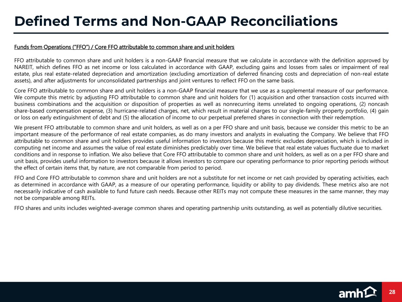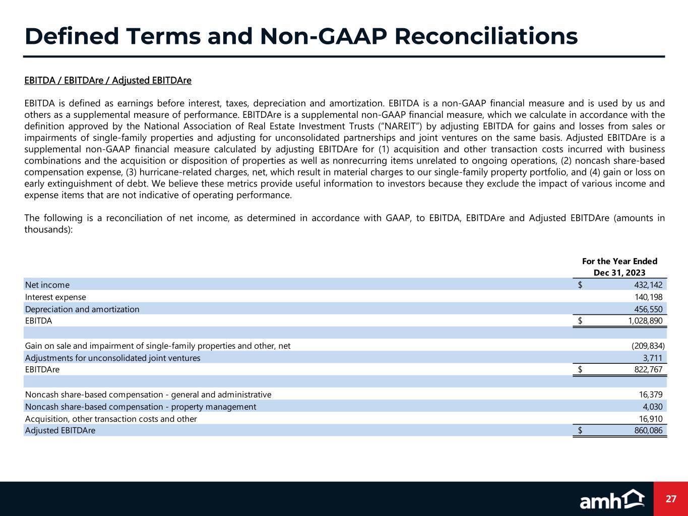 27 EBITDA / EBITDAre / Adjusted EBITDAre EBITDA is defined as earnings before interest, taxes, depreciation and amortization. EBITDA is a non-GAAP financial measure and is used by us and others as a supplemental measure of performance. EBITDAre is a supplemental non-GAAP financial measure, which we calculate in accordance with the definition approved by the National Association of Real Estate Investment Trusts (“NAREIT”) by adjusting EBITDA for gains and losses from sales or impairments of single-family properties and adjusting for unconsolidated partnerships and joint ventures on the same basis. Adjusted EBITDAre is a supplemental non-GAAP financial measure calculated by adjusting EBITDAre for (1) acquisition and other transaction costs incurred with business combinations and the acquisition or disposition of properties as well as nonrecurring items unrelated to ongoing operations, (2) noncash share-based compensation expense, (3) hurricane-related charges, net, which result in material charges to our single-family property portfolio, and (4) gain or loss on early extinguishment of debt. We believe these metrics provide useful information to investors because they exclude the impact of various income and expense items that are not indicative of operating performance. The following is a reconciliation of net income, as determined in accordance with GAAP, to EBITDA, EBITDAre and Adjusted EBITDAre (amounts in thousands): For the Year Ended Dec 31, 2023 Net income 432,142$ Interest expense 140,198 Depreciation and amortization 456,550 EBITDA 1,028,890$ Gain on sale and impairment of single-family properties and other, net (209,834) Adjustments for unconsolidated joint ventures 3,711 EBITDAre 822,767$ Noncash share-based compensation - general and administrative 16,379 Noncash share-based compensation - property management 4,030 Acquisition, other transaction costs and other 16,910 Adjusted EBITDAre 860,086$ Defined Terms and Non-GAAP Reconciliations