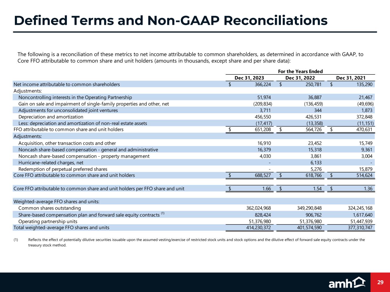 29 The following is a reconciliation of these metrics to net income attributable to common shareholders, as determined in accordance with GAAP, to Core FFO attributable to common share and unit holders (amounts in thousands, except share and per share data): Defined Terms and Non-GAAP Reconciliations Dec 31, 2023 Dec 31, 2022 Dec 31, 2021 Net income attributable to common shareholders 366,224$ 250,781$ 135,290$ Adjustments: Noncontrolling interests in the Operating Partnership 51,974 36,887 21,467 Gain on sale and impairment of single-family properties and other, net (209,834) (136,459) (49,696) Adjustments for unconsolidated joint ventures 3,711 344 1,873 Depreciation and amortization 456,550 426,531 372,848 Less: depreciation and amortization of non-real estate assets (17,417) (13,358) (11,151) FFO attributable to common share and unit holders 651,208$ 564,726$ 470,631$ Adjustments: Acquisition, other transaction costs and other 16,910 23,452 15,749 Noncash share-based compensation - general and administrative 16,379 15,318 9,361 Noncash share-based compensation - property management 4,030 3,861 3,004 Hurricane-related charges, net - 6,133 - Redemption of perpetual preferred shares - 5,276 15,879 Core FFO attributable to common share and unit holders 688,527$ 618,766$ 514,624$ Core FFO attributable to common share and unit holders per FFO share and unit 1.66$ 1.54$ 1.36$ Weighted-average FFO shares and units: Common shares outstanding 362,024,968 349,290,848 324,245,168 Share-based compensation plan and forward sale equity contracts (1) 828,424 906,762 1,617,640 Operating partnership units 51,376,980 51,376,980 51,447,939 Total weighted-average FFO shares and units 414,230,372 401,574,590 377,310,747 For the Years Ended (1) Reflects the effect of potentially dilutive securities issuable upon the assumed vesting/exercise of restricted stock units and stock options and the dilutive effect of forward sale equity contracts under the treasury stock method.